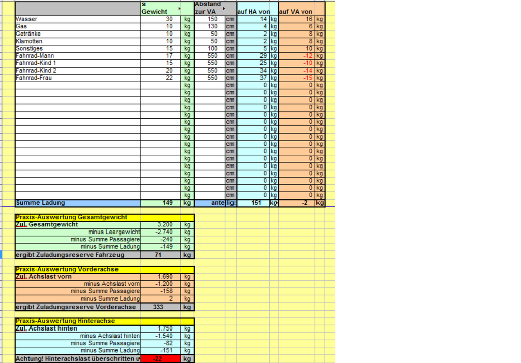 genau, das meine ich, der kann Dir zumindest sagen, wohin Du Dich wenden sollst. Thomas Danke, so mache ich das. Da wir die nächsten Wochen erstmal anderweitig Urlaub machen, werde ich das Ergebnis erst Anfang August hier mitteilen können. Marko Hallo Zusammen, da wir ohne Womo im Urlaub waren, melde ich mich erst jetzt wieder mit einem Zwischenstand. Ich war heute auf einer öffentlichen Waage. Die Messung ergab folgendes Werte (jeweils vom zulässigen Gewicht): Gesamtgewicht: 2740 von 3200 (+460 kg) Vorderachse: 1200 von 1690 (+490 kg) Hinterachse: 1540 von 1750 (+210 kg) Das Fahrzeug war vom Prinzip reisefertig, ohne mich, Wasser, Gas und Extras. Da das ja noch nicht die Wahrheit ist, habe ich die offizielle Beladungstabelle des ADAC ausgefüllt. Dort werden ja auch die Hebelwirkungen etc. berücksichtigt: ![]() Mit allem drum und dran, insb. der 4 Fahrräder, die mir ja immer Sorgen bereitet haben, ergibt sich an der Hinterachse eine Überladung von 22 Kg. Das ist natürlich ein Problem, aber das ist mit Ausräumen von überflüssigen Dingen ja zu handhaben und erklärt aber keinesfalls die Reifenschäden hinten. Denn, es ergibt sich ein HA-Gewicht von 1772 Kg, wobei die Reifen maximal Belastbar sind mit 1030 kg (2060 Kg). Damit hätten die Reifen bei voller Beladung eine Reserve: 1772/2 = 886 zu 1030 ist gleich 144 Kg. Was habe ich nun noch unternommen: 2 neue Reifen hinten bestellt (Vanco Camper, ca. 140 EUR inkl. Montage) Tiremon TM -150 NST bestellt (probiere ich mal aus, ggf. muss es auch der TM-210 sein - 5,5 bar zu 11 bar max. Luftdruck, der 150 ist jedoch das neuste Gerät). Am Montag 10.8.2015 fahre ich zum Reifenhändler zur Monatage, der sich auch den/die alten Reifen ansehen wird. Vll. kommen wir da noch zu einem Streit mit Gerutti. Insgesamt würde ich also sagen, dass der alte Reifen einfach Mist war. Da ich immer auf den Luftdruck achte (max. 4,7 bar nach PSI) und mit ca. 4,5 (VA) und 4,6 (HA) fahre, haben wir vermutlich nicht viel falsch gemacht. Ich werde berichten, wie das mit dem Händler ausgegangen ist. MacGyverHB (Marko) Hallo Zusammen, Reifenhändler meint zu den Gerutti-Reifen nur: China-Mist und nach nun 2 Jahren gibt es wenig, was man machen kann. Niemand wüsste ja, was wir in den 2 Jahren gemacht hätten mit den Reifen. Nun gut, jetzt sind die Vanco Camper drauf, die einen wesentlich stabileren Eindruck machen. Ohne Felge konnte man die Gerutti mit der Hand zusammen drücken (wenn der Reifen liegt), das geht mit den Conti Reifen nicht. Resümee: Wer billige Reifen nimmt (oder nehmen muss), zahlt zum Einen 2x und zum anderen ist es gefährlich. Also, da nicht sparen, dass weiss ich jetzt.