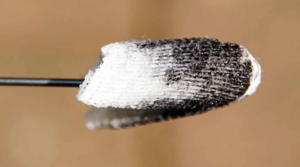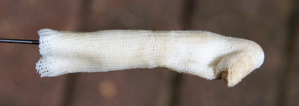 Trotz anfänglicher Skepsis wollte ich wissen wie es wirklich in meinen Schläuchen aussieht. Also habe ich einen 1m langen Draht genommen und ein Stück Mullbinde dran befestigt die gerade so in den Schlauch rein paßt. Als erstes den Schlauch, denn ich zum Befüllen des Wassertanks benutze, getestet. Das Ergebnis: schwarzer Belag. Dabei habe ich den Draht nur ein mal auf 90 cm Tiefe rein geschoben und wieder raus geholt.