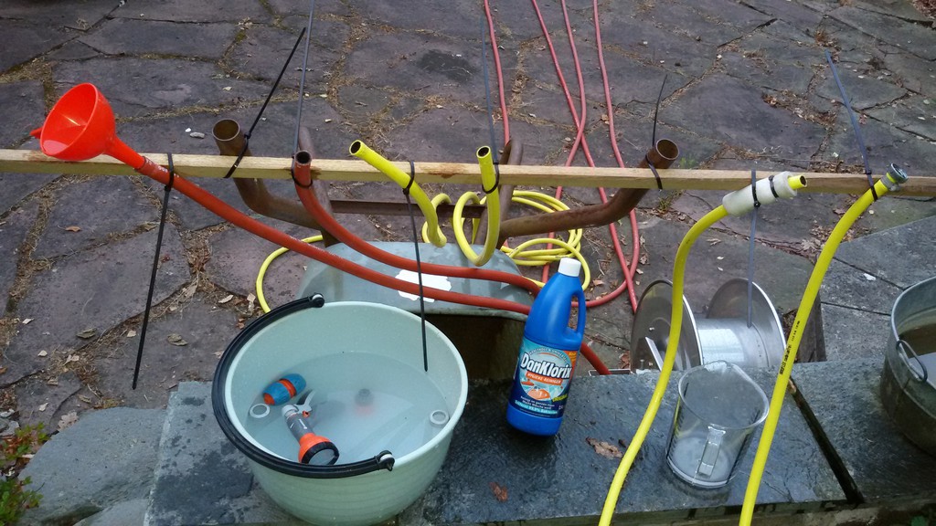 Ich habe mir allerdings sicherheitshalber vor der Nutzung des Gartenschlauchs entsprechend dem Schlauchdurchmesser stramm passende Stücke aus geschlossenzelligem Schaumstoff zurechtgeschnitten. Die habe ich dann mit Wasserdruck durch den ganzen Schlauch geschickt. Ich bin echt erschrocken, was da für eine Brühe herauskam. Nach einer anschließenden Desinfektion des Schlauchs habe ich ihn dann zur Befüllung zur Befüllung des Tanks guten Gewissens verwenden können.