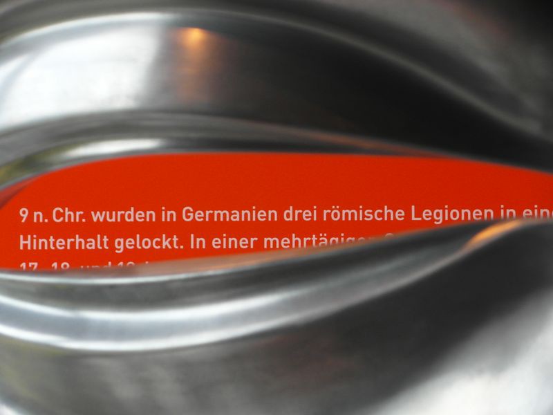 Im Empfangsgebäude wird in der Sonderausstellung “Ich Germanicus! Feldherr, Priester und Superstar” der künftige Anwärter auf den Kaiserthron in Rom, Germanicus (bedeutet soviel wie “Sohn des Germanenbezwingers”) anhand von Bild- und Schrifttafeln und zahlreichen Exponaten vorgestellt. Germanicus kommt in den Jahren 15/16 n. Chr. mit 8 Legionen und tausend Kriegsschiffen als Rächer von Varus und Roms nach Germanien, und will Arminius und seine Germanen unterwerfen. Doch scheitert er ebenso und muss unverrichteter Dinge wieder abziehen, da dies von Kaiser Augustus so angeordnet wurde. Nicht weit entfernt, befindet sich in dem mit Metallplatten verschalten Turm die ständige Ausstellung, in der mit Bildern, Tafeln und Fundstücken erklärt wird, wieso hier auf dem Gelände 9 n. Chr. die Schlacht zwischen Arminius (Hermann) mit seinen Cheruskern und dem römischen Statthalter Publius Quintilius Varus in Germanien und seinen drei Römischen Legionen stattgefunden haben soll. Arminius bereitete dabei mit einer heute als Guerillataktik bekannten Kampfweise den erheblich besser ausgerüsteten und ausgebildeten Römern, die auch zahlenmäßig in der Überzahl waren, eine vernichtende Niederlage. Als Varus die Ausweglosigkeit seiner Lage klar wurde, beging er noch auf dem Schlachtfeld Selbstmord. Als Ausspruch von Kaiser Augustus ist überliefert:”Varus, Varus, gib mir meine Legionen wieder.”. Mit diesem Wissen bepackt ziehen wir zum Park Kalkriese nebenan, wo man versucht hat, dass Gelände und seine Struktur etwas nachzustellen.