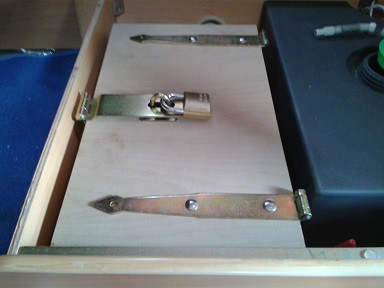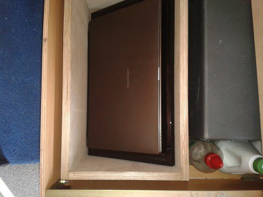 Sowas mit Batterie als Getarntes Versteck hatte ich mir auch überlegt. - Nun aber doch entschieden, eine richtige "Schutzkiste" einzubauen. Gross genug, dass der Laptop drin Platz findet. Über Gewindestangen, Hülsen und Konterplatten mit der Bodenplatte verschraubt. Auf und raus kriegt man den nicht so schnell!