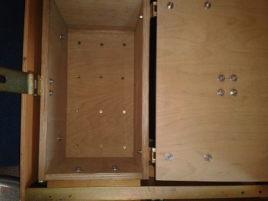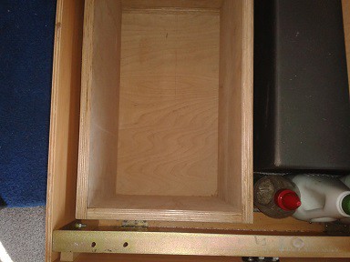 hab mir heute aus 18mm Multiplex eine Kiste für die vordere Dinette-Sitzbank gebaut, um Wertgegenstände wenigstens vorm schnellen Zugriff z.B. beim Einkaufen oder Hundespaziergang etwas besser zu sichern. Die muss jetzt noch mit der Bodenplatte verschraubt werden. (Seitlich wird sie auch noch vorne und links mit Abstandskötzen und Schloss-Schrauben befestigt. Rechts ist ein Teil des Frischwasssertanks. Da geht das nicht.)