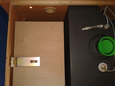 Oben eine Verschraubung aufgeklebt, ein paar Kabel als Tarnung in den Behälter gehen lassen und das ganze so eingebaut, daß Du es nach lösen von zwei unteren seitlichen Stiften nach oben herausholen kannst - so wäre meine Lösung gewesen