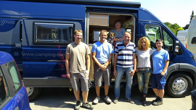 Unser blauer Peugeot-Kastenwagen steht bereit um für Fenster und Toilettenkassette die Löcher in die schöne Karosserie zu schneiden.