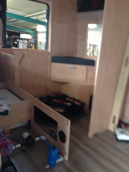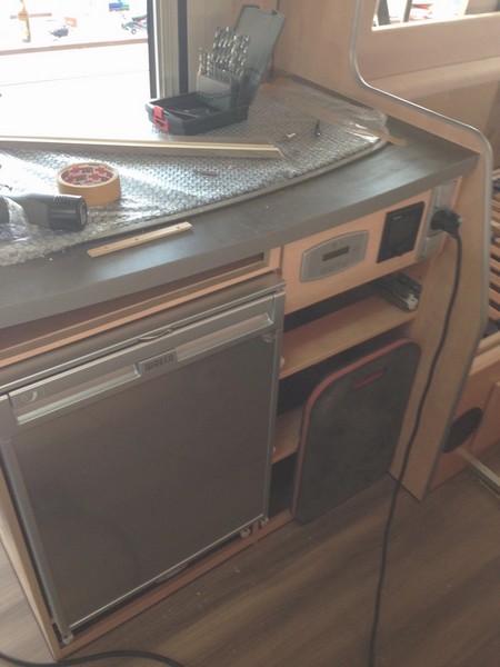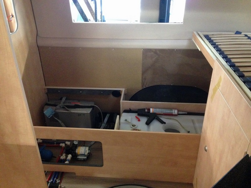 Unter dem Längsbett auf der Beifahrerseite werden Brennstoffzelle (links) und Frischwassertank (rechts) eingebaut. Da wir mit unserem Campingbus überwiegend frei stehen und es z.B. bei unseren Überwinterungsreisen oft weit und breit keine geöffneten Campingplätze und keine Wohnmobil Stellplätze mit Stromversorgung gibt müssen wir hinsichtlich Stromversorgung und Heizung unabhängig sein. Deshalb haben wir uns auch erstmals für eine Dieselheizung entschieden. Zum Kochen wird für die Gasversorgung ein Unterflur-Gastank installiert. So geht innen kein Stauraum für Gasflaschen verloren und das Problem des Gasflaschen-Tausches im Ausland entfällt in Zukunft.