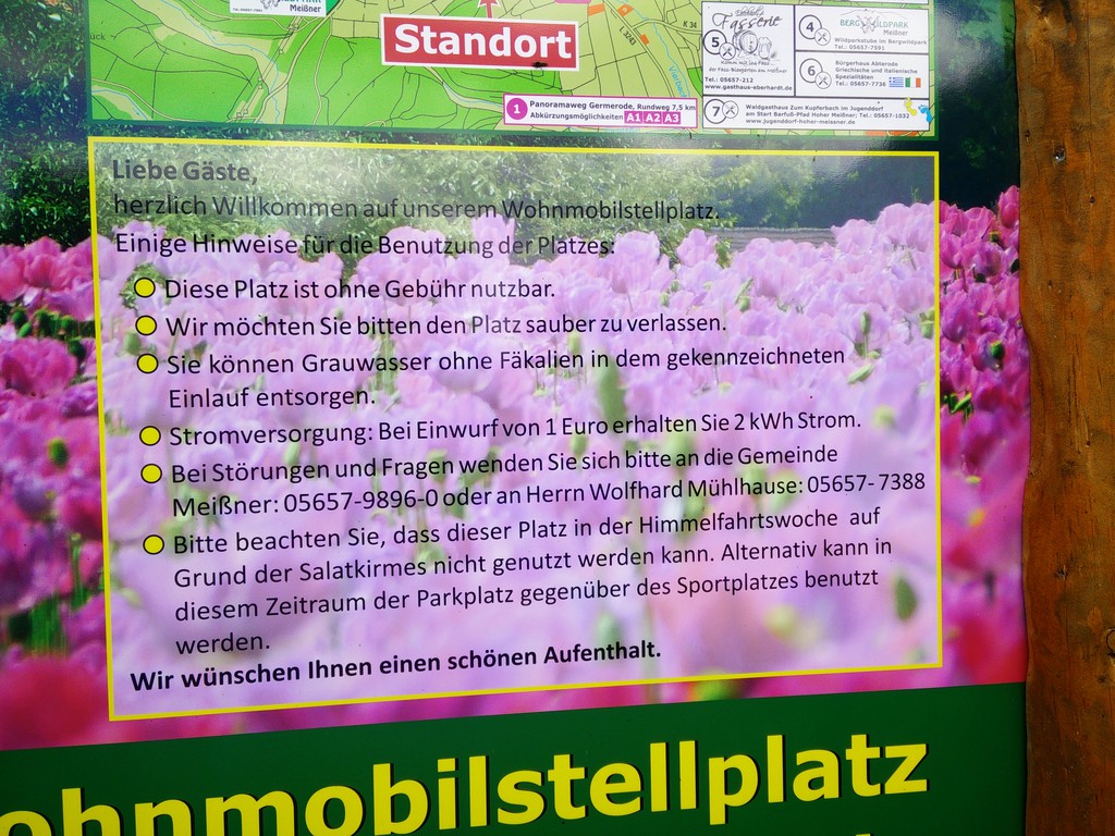 Art des Platzes: Stellplatz Name des Platzes: Wohnmobilstellplatz Germerode Adresse: Deutschland, 37290 Meißner, Auf dem Berge 2 Latitude: 51.191853632228 Longitude: 9.901041227478 V/E: Ja Stellplatz eingetragen von: pipo --> Link Link zum Zielpunkt: --> Link ![]() Schöner, sehr ruhiger Stellplatz am Rande des Meißners und dem Ort Germerode. Idealer Ausgangspunkt um den Meißner zu erwandern. Stellplatz kostenlos. Strom 1€/2KWh Im Ort gibt es einen kleinen Laden und eine Gaststätte mit sehr guter bürgerlicher Küche :mrgreen: ![]() ![]() ![]() ![]() |