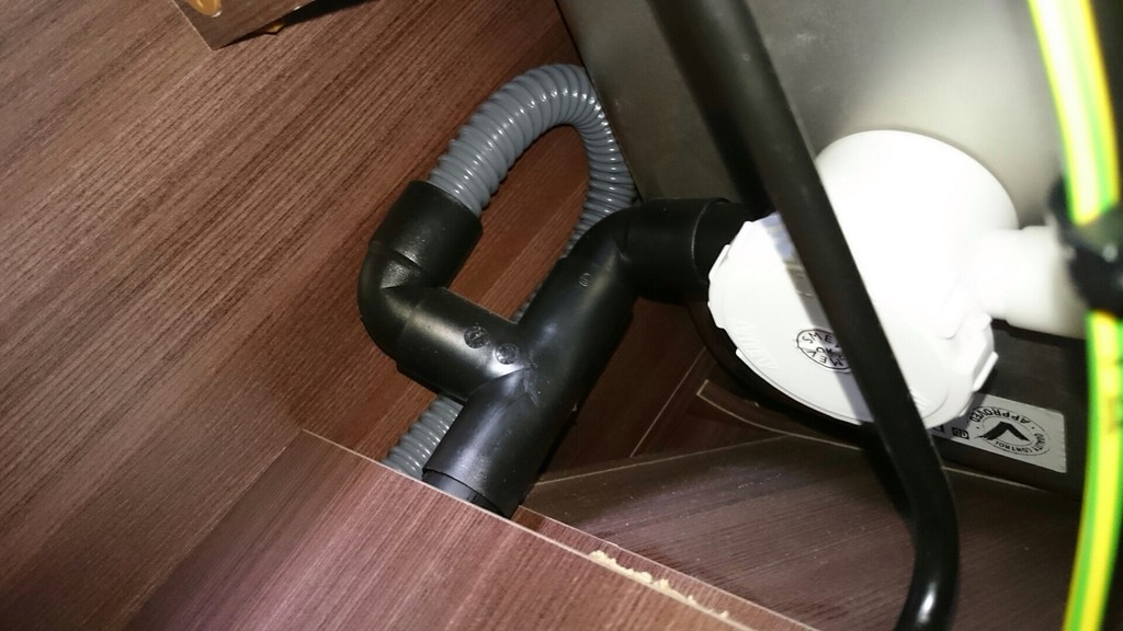 Sieht man das schwarze Hartplastikrohr nach unten gehen. Das endet irgendwann im Abwassertank.... Das graue Flexieble Rohr zweigt davon ab (am Foto gut zu erkennen) schleift kurz nach oben geht dann runter, durch den Boden ins Freie.....?!?!?!?!?! Wozu ist das gedacht?