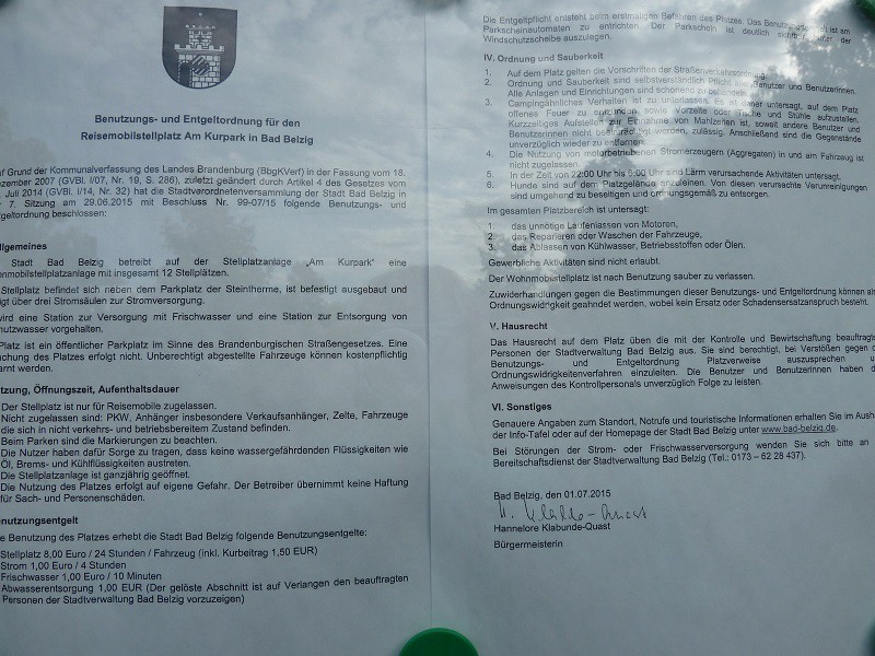 Hallo, - großer Parkplatz neben dem Kurpark und dem Thermal- und Freizeitbad - ohne Infrastruktur, aber schön ruhig MfG basi Hallo, Stellplätze sind ziemlich eng, obwohl genug Platz gewesen wäre. Abgetrennter Bereich vom großen Pkw-Parkplatz. Untergrund bei Regen sehr schlammig. Entleerung der WC-Kassette sehr unpraktisch, da enger Einfüllstutzen am Boden. Besser für Festtank geeignet. Schöne ruhige Lage, aber das hätte man an diesem neuen Stellplatz besser machen können. Andreas Waren vom Freitag 25. bis Samstag 26.09.2015 auf diesem Stellplatz. Der erst im Frühjahr neu angelegte SP bietet 12 Stellplätze und besteht aus zwei Terrassen mit je 4 Plätzen nebeneinander und 2 Plätzen hintereinander. Stromsäulen sind vorhanden. V/E liegt an der Straße noch vor der Zufahrt zum SP. Bezahlt wird an einem Kassenautomaten. Gebühr: 8,00 Euro/24 Stunden Strom: 1,00 Euro/ 4 Stunden Frischwasser: 1,00 Euro/10 Minuten Entsorgung: 1,00 Euro (allerdings keine Möglichkeit zum Bezahlen gefunden) Hier ein paar Fotos: ![]() V/E ![]() Kassettenentsorgung ![]() Frischwasserzapfsäule ![]() Nutzungsordnung ![]() Kleines Update: Es handelt sich um einen abgetrennten Stellplatz neben einem Parkplatz. Insofern ist die Angabe als Parkplatz falsch. Ansonsten beträgt die Tagesgebühr nun 9 EUR, alles andere wie beschrieben. Entwässerung soll man am Parkautomaten bezahlen, aber es geht auch so. Wenn man in die Therme gehen möchte, werden anscheinend 10% auf den Eintrittspreis angerechnet (nicht persönlich ausprobiert). Gruß Vemi Liebes Moderatorenteam, bitte auf "Stellplatz" und "V/E: ja" ändern. Gruß Vemi die Daten sind nun aktuell Moin, waren für 1 Nacht Pfingstsamstag auf Sonntag hier. 9 € kosten 24 Stunden Aufenthalt. Darin 1,50 € Kurtaxe für die 1. Person. Jede weitere Person ist mit 1,50 € Kurtaxe dabei. Müssen Kinder auch 1,50 € zahlen?? :nixweiss: ![]() ![]() Video vom SP --> Link |