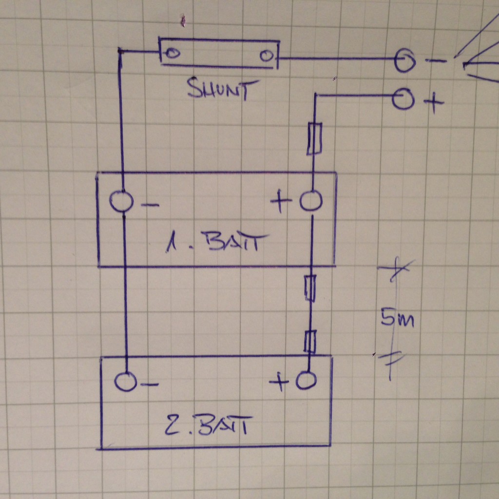 Ob Parallel oder Diagonalverschaltung spielt bei der Messung keine rolle!° Die Diagonalverschaltung soll nur dazu führen die Batterien gleichmässiger aufzuladen. Aber Richtig ist das die Batterien (Minuspol) auf der einen Seite des Messschunt's sind (und auch wirklich nur die Batterien und KEIN Kontakt zu irgendeiner Masse oder Verbraucher) und alles andere auf der anderen Seite Verbraucher Massekontakt... Hallo namenloser Silber, Er hat geschrieben, die Zweite Batterie zum Shunt parallel geschaltet. Dein Alf Nun doch noch ein Plan zur besseren Verständigung Aze ![]() Es handelt sich ja hier um einen MPPT-Regler und da sind Ladestrom und Solarstrom zwei verschiedene Größen. Die Angaben bei Votronic, was da nun angezeigt wird, sind nicht eindeutig. Ich habe einmal die Angabe 'Ladestrom' und zweimal 'Solarstrom' (Solaranlage) gefunden. Ich denke aber hier wird der Solarstrom angezeigt, denn erstens heißt das Teil Solar-Computer und zweitens will ich wissen, was meine Solaranlage derzeit zu leisten vermag (5,6A bei 100W ist schon ein guter Wert, wahrscheinlich Isc). Wenn ich wissen will, wie es meiner Batterie geht, nehme ich die Werte aus dem Batterie-Computer und interpretiere sie mit dem entsprechenden Hintergrundwissen. krischan Hier ein Bild von meinen beiden Votronic Solarcomputern. Sie zeigen ganz klar an, was von den beiden Anlagen als Ladestrom fliesst. Zusammen 23.7 A. Auf dem BC von Philippi sieht man oben die Bilanz: 22.9 A. Die Differenz von 0.8 A ist der aktuelle Verbrauch des Fahrzeugs. Sobald der Akku gegen voll geht, gehen die Votronic-Anzeigen zurück bis 0 bei vollem Sonnenschein! ![]() Dank Schaltbild sieht Mann, dass der Shunt richtig angeklemmt ist. Was aber falsch ist, in der Parallelschaltung der Batterien 2 x 5 m Leitung und zusätzlich 2 Sicherungen vor der hinteren Batterie. Das Resultat ist, dass die vordere Batterie 80 % der Belastungsspitzen puffern wird. Besser wäre hier, auf die Sicherungen zu verzichten, das Massekabel doppelt zu ziehen und die Masse von.der hinteren Batterie wieder nach vorne als Minuspol auf den Shunt zu klemmen. Dein Alf Hallo Alf So ist es geplant. Die 2.Batterie kommt unter den Beifahrersitz. Dann sind es nur noch 2 m Massekabel mit der richtigen Verschaltung. Die Sicherungen wurden vom Hersteller des Fahrzeugs installiert. Kann man darauf verzichten? Aze Wenn das alles so stimmt, dann sollte man sich mal auf die Suche nach den fehlenden Ampere machen. Das können ja nur Verbraucher sein, die an sind. Oder mal mit einem Multimeter die angezeigten Werte überprüfen. Vielleicht ist ein Mess"computer" falsch kallibriert... oder der Mess-Shunt passt nicht zum Panel.
