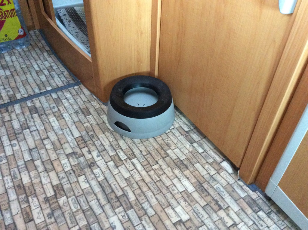 Es sollte während der Fahrt Wasser möglichst schwappsicher zur Verfügung stehen und im Stand auch noch der Futternapf Platz finden, ohne das man im WoMo Slalom gehen muss, oder alles sich im Eingangsberich befindet.
