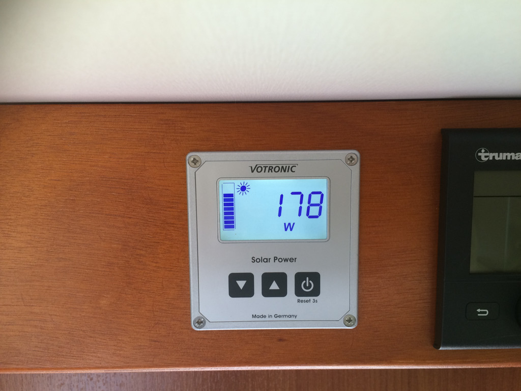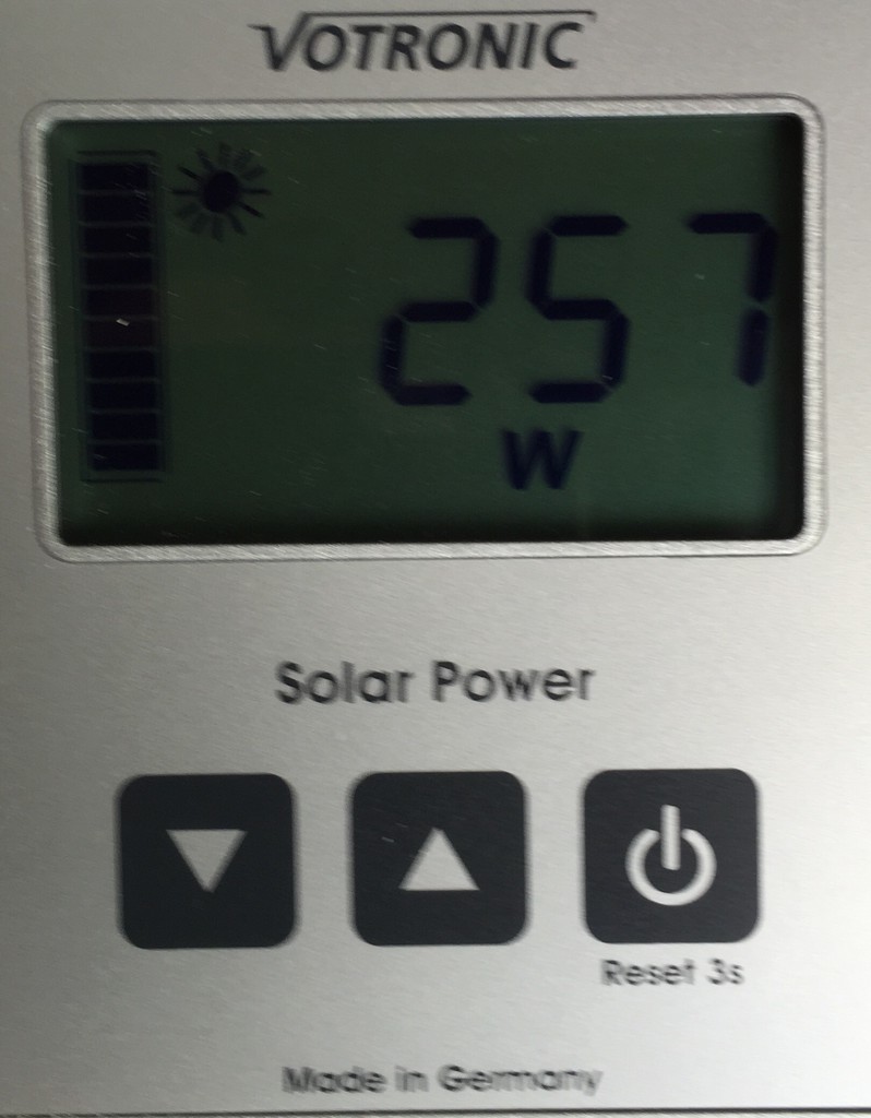 War es flach am Boden oder im Winkel? Lag auf dem Bordstein auf. Demnach leichte Neigung Richtung hochstehender Sonne. Wir ernten z.Zt. im Schnitt 60 Ah am Tag. Ort Normandie. Schoenes sonniges Wetter . 400 Wp Solar und Batterien 2 mal 260 Ah. Willi Ich habe nun mal 2 Panele aufgestellt. So kriegte ich in der Toscana 460W Spitzenleistung um die Mittagszeit. Sichere 200W von 10 - 17.00 Uhr. um damit den Absorberkühli zu betreiben. Ich werde es dann mal im Dezember testen wenn die Sonne am tiefsten ist. Wir sind zur Zeit in Oliva Spanien, meine 300 Watt Aldenanlage mit MPP liefert maximal 40 Ampere pro Tag. Das ist im dieser Jahreszeit zu wenig, unser Verbrauch liegt ohne E Bikes bei 60 bis 80 Ampere. So wie das aussieht benötigte ich 600 Watt um klar zumkommen.