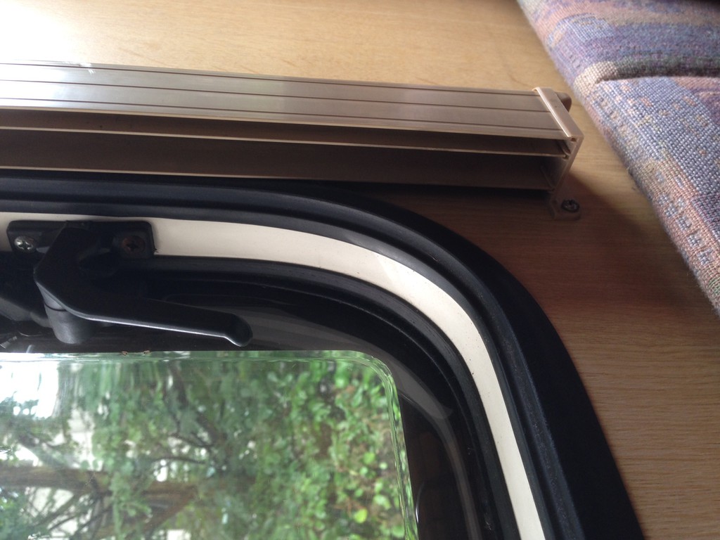 Hier soll es aber erstmal um die Kombirollos gehen. Fenster sind wohl von Polyplastic ("Roxite 80"). Fliegengitter und Verdunkelungsrollo werden jeweils von oben nach unten gezogen. Sie werden durch links und rechts angebrachtes Plastikprofil geführt. Am Fenster liegt das Fliegengitter, davor das Verdunkelungsrollo. Durch Löcher im Profil lässt sich das Verdunkelungsrollo in den Führungen einrasten (Der Griff hat links und rechts kleine Zughebel ähnlich wie beim Seitz S3