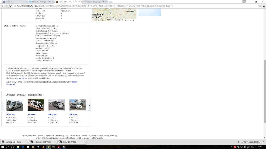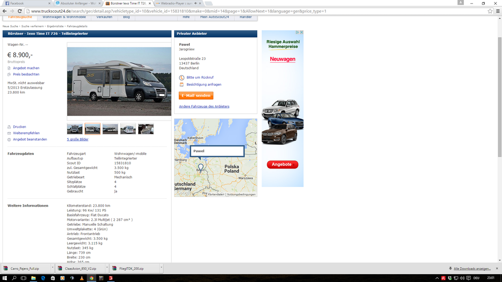 Hm, also da stimmt ganz sicher was nicht! Falls doch alles ok sein sollte....ich nehm 2 davon 8) Eisbaerchen Helmut Wenn ich heute nach der Arbeit wieder Zuhause bin werde ich gucken ob die noch drinnen sind.. Warum is DK und Niederlande schlimm? Hab da ja mal überhaupt keine Erfahrung.. Ja Messe wäre schön da bekomm ich aber wohl so kurzfristig meine Freundin nicht zu.. Kann ich mir die Aufbau Typen nicht auch bei Krüger Caravan in raisdorf angucken..? Also die werden ja wahrscheinlich nur eine Marke führen aber die werden doch sicherlich alle Marken alle Typen führen oder? Der Händler hat Hymer, Hobby und Carado, somit also eine bunte Auswahl. Sollte für einen ersten Überblick ausreichen. :) Danke Michael.. Bin noch nicht dazu gekommen bei dem mal genauer zu gucken zumal ich da immer mit großen Augen dran vorbei fahre.. Nun interessieren mich aber noch zwei Sachen woher weißt du was die führen? Google? :D Und weißt du ohne Google ob die vermieten.. Google ich heute abend sonst :) Danke für eure Hilfe eines ahnungslosen Schonmal :) Google ist eben unser aller Freund :) Daher weiß ich was die führen und kann dir auch sagen das dort vermietet wird :) Die Preise sind m. E. "üblich". Ebenso die Kaution von 1.500,00 € sowie die Servicepauschale von 125,00 €. Was ich nicht gefunden habe ist eine Kilometerbegrenzung pro Tag, was ich gut finden würde wenn es diese tatsächlich nicht gibt. Hallo Nordlicht, der Tipp mit der Messe ist auf jeden Fall eine gute Gelegenheit, um unverbindlich zu schauen. Aber bedenke, dort stehen Neufahrzeuge (!). Solltest Du dann später nach einem Gebrauchten schauen, könntest Du vielleicht falsche Erwartungen haben. Bei der Finanzierung möchte ich nur noch eines Anmerken: Ein WoMo in einem halbwegs vernünftigen Zustand ist sehr teuer. Ihr seid noch sehr jung. Wir wurden mit 23J./22J. zum ersten Mal Eltern, wenn diese Situation bei Euch eintreten könnte, ist u.U. euer WoMo zu klein, oder die Freizeitgestaltung verschiebt sich, oder, oder, oder... Wir haben uns letztes Jahr ein WoMo gekauft und fahren jetzt ohne Kinder. Jetzt um die Messe herum und am Ende der "Campingsaison" kann man bestimmt auch eher fündig werden. Aber ich stimme den Empfehlungen zu, sich erst einmal Fahrzeuge zu mieten. Stellplätze in NL und DK sind eher rar und man muss häufig auf Campingplätze ausweichen. In DK ist der Standard wohl sehr hoch, aber auch die Lebenshaltungskosten sind etwas höher als bei uns, und in NL Ist die Gastronomie auch sehr, sehr teuer. Dafür ist die Nordsee und die Strände sehr schön (und ohne Kurtaxe!). Schaue immer auf den Internetportalen für Gebrauchtfahrzeuge, aber setze dich nicht unter Druck. Genießt euer Leben solange es noch geht, der Ernst kommt früh genug!! Danke.. Kannst Du mir was zu den Preisen sage sind die gut? Ja das muss ich den alles gucken wenn es so weit ist mit einem gebrauchten wohnmobile.. Vor allen ist dein Ansatz prima VOR Anschaffung eines Mobils sich hier mal schlau zu machen. Lese dich mal durch die verschiedenen Threads durch, dann hast schon mal jede Menge Wissenslücken ausgemerzt und fragen kost ja auch nix. Nichtdestotrotz würde ich trotzdem mal auf eine Messe fahren, nicht um ein Auto zu kaufen sondern erstmal einen Überblick zu bekommen, was einem überhaupt zusagt oder was ein totales NOGO ist. Hier einmal der nachgereichte link.. was ich aber auch nun gerade erst sehe die Stehen entweder in Italien oder in Spanien.. hat das auswirkung auf irgendwas? ja messe vllt nächstes jahr :D dieses Jahr schaffe ich es leider nicht.. :( zumal ich eher diesen monat schon loslegen würde als erst nächstes jahr gruß Die dürften dann nicht koscher sein. :roll: Der Link geht auch nicht. ![]() ![]() hier mal Bilder von dem angebot.. Ich bezweifle, dass das ein seriöses Angebot ist. Schade hab ich aber schon mit gerechnet.. aber da gibt es einige von.. man beachte mal die weiteren angebote unten im oberen bild.. :?: Moin Nordlicht!Bleib entspannt und hetz Dich nicht selber.Fang einfach beim "örtlichen" Händler an Dir ein "Gefühl" für die Materie auf zubauen.Beim "Örtlichen" kann man durchaus für nen entspannten Taler mal was mieten etc.Und dann auf die Messen,wenn Zeit ist,um Grundrisse,Preise,Qualität zu "checken" ,damit man z.B.ein Gefühl für Gebrauchtpreise bekommt/entwickelt.Wir haben uns z.B. 2,5Jahre belesen/Messen und Händler besucht/Probegessen/Fragen hier gestellt etc.Und hätte der Örtliche nicht durch Zufall gerade zu dem Zeitpunkt,wo ich mal wieder im Netz die Angebote "gecheckt"habe,genau das Paket aus Auto/Zustand/Ausstattung und Preis gehabt,hätten wir mit Sicherheit immer noch keins. "Die Ruhe ist dem Menschen heilig,nur Verrückte haben es eilig". Schönen Tag erstmal.Uwe Danke Uwe.. :) werde mich nun hier erstmal belesen und dann gucke ich das ich zum nächsten Jahr nen Womo mal gemietet bekomme für nen paar Tage :) Danke für eure zahlreichen Hilfe.. |
