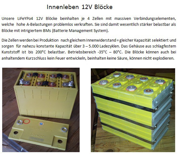 Für einen 12 V Starter-Akku: Eine 40 Ah Zelle kostet 60 Euro. Die ganze Schutzelektronik über 400 Euro. Da muss jeder selber überlegen, wie weit er absichern will ... :gruebel: (Dies abgesehen davon, dass ICH whs keine Abschaltung beim Fahrzeugakku will!) Ganz anders sieht es natürlich bei den 400 Ah Zellen aus! Wie gesagt ich würde Lastbalancer wie Ev Power verwenden ! Die Zellen vorher mit einem kleinem Ladegerät 2 A über 2 Tage laden. Den Rest schafft dann der Balancer allein. Das kleine Ladegerät kann immer zur Batterie Pflege benutzt werden. Ein kleiner Tipp noch. Das Victron blue power hat einen Stecker. Einen direkt an die Starterbatterie und den anderen als Ovp Ladegerät. 2 Fliegen mit einer Klappe. Wie verhalten sich die neuen Smartcharge Ladesteuerungen im Auto wenn so ein niederohmiger Akku verbaut wird? Gibt es schon Erfahrungen? Hier die versprochene Auskunft der Fa. Nothnagel-Marine: ""Diese LiPro-Typen sind Starterbatterien ohne elektronische Überwachung u. ohne Balancing. Bei der Nutzung als Starterbatterie sind die Akkus immer nahezu voll u. werden nicht unter 80-90% entladen, eher noch weniger, daher ist die Zelldrift nicht so groß."" Danke ! Also zumindest Balancing. Bloß wie anschliessen ? Geht wohl nicht, weil oben zu? Deshalb uninteressant? Gr. Richi