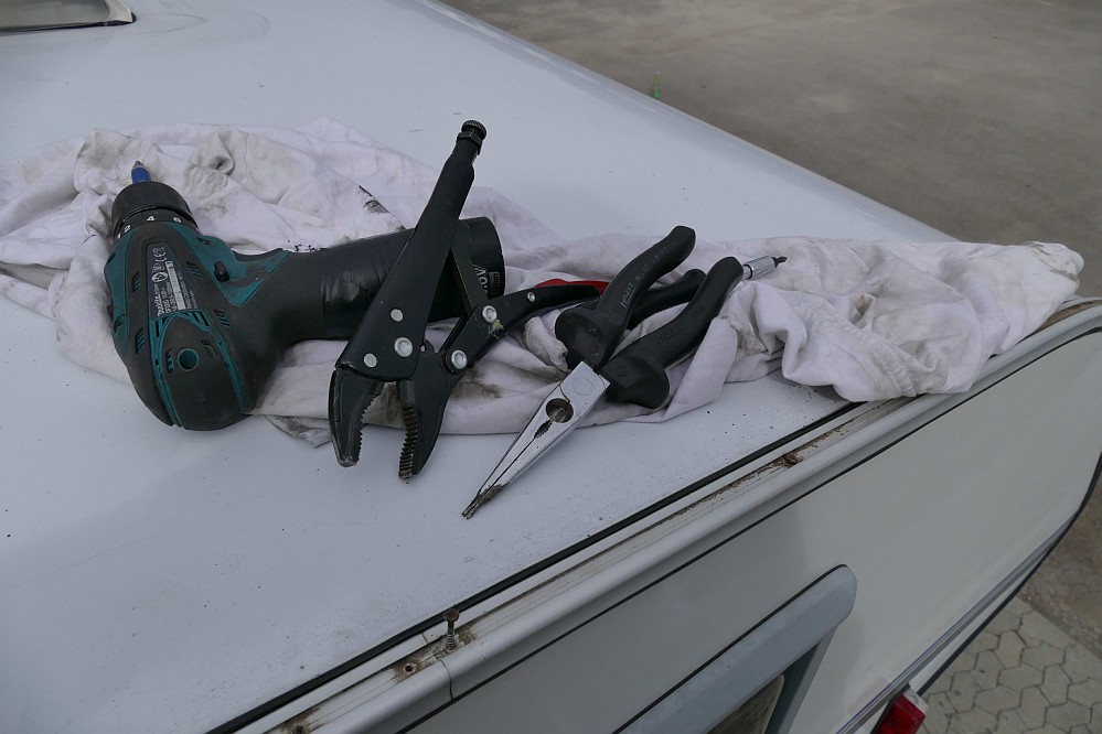 Bei manchen Schrauben half der Schrauber, bei vielen nicht. Erst mit der Spitzzange soweit wie möglich lösen und dann mit der Spreizzange voll raus drehen