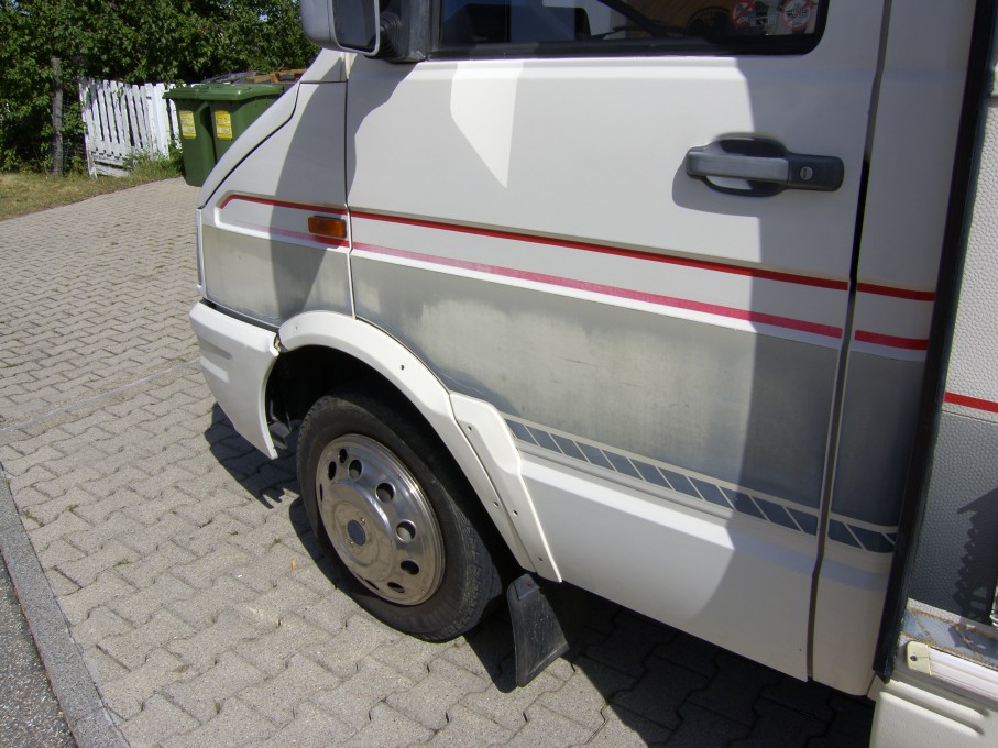 unser Alkoven war als wir ihn abgegeben haben 26 Jahre alt. Der hat Ringsumlaufende rote Zierstreifen. Auf dem Aufbau lackiert, auf dem Fahrerhaus Folie. Die Folie war noch absolut ok, der Lack war stark verblasst, ist typisch für rot.