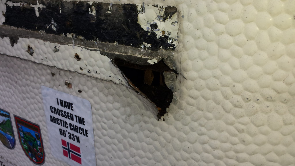 mit Erschrecken heute den Fahrradträger an der Rückwand abmontiert.War ein kleiner Riß an der Aufnahme in der Außenhaut.