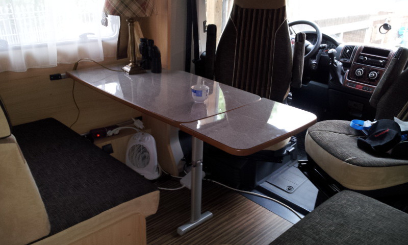 In der hellen Farbe. Eine neue Tischplatte haben wir vom Schreiner machen lassen, und einen Fuß orginal von Hymer montiert. Diesen koennen wir drehen, und vor und zurueck schieben. Den alten Tisch haben wir bei Ebay verkauft. Nun fehlt uns nur noch eine verchromte Blende fuer das EBL 99