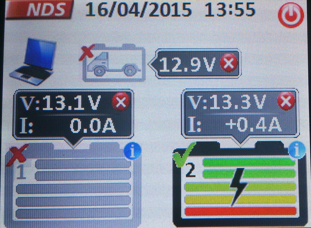 - die 2. Batterie ist in Erhaltungsladezustand und am Bordnetz aktiv, deshalb grüner Haken. sie hat 13.3V und wird zur Zeit mit 0.4A geladen.