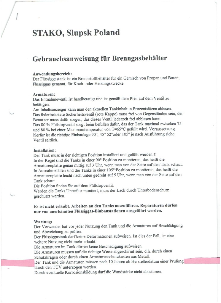 Moin, die Brenngastanks gibt es prüffrei, die erkennt man an der Nr. 67R-01. Die brauchen also nicht nach 10 Jahren ausgebaut und getüvt werden! Mit Antriebsgas kenne ich mich nicht aus. OK, ich weis das für die LPG Tanks nach R67... Ich habe mir einen neuen Stako Brenngastank eingebaut letztes Jahr...in dem Prüfbericht steht nur die das Prüfjahr und das der Hersteller die Docu nach 10 Jahren weg werfen darf. Hergestellt und geprüft nach E20 67R-010367 . ...also kein Hinweis das er nach 10 Jahren neu geprüft werden muss. was willst du jetzt wissen? Mein jetziger Tank hat leider kein R67-01 und da steht ausdrücklich, dass er nach 10 Jahren neu geprüft werden muss! :?