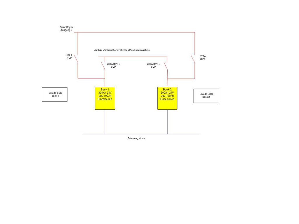 Das Problem ist, dass die beiden Batterien, trotz Lastabwurf der einen Batterie ja über den Ladekreis zusammengeschaltet sind, und somit die Trennung wirkungslos ist - die Batterien sind immer noch verbunden. Gleiches gilt auch wenn die Eine OVP auslöst, wird sie über den Lastkreis weiter geladen, bis auch die 2. OVP auslöst. Der Solarregler oder andere Ladequellen sollten vorher zusammen auf den Lastkreis geschaltet werden - meinetwegen über ein gemeinsames OVP Relais / SSR. Das habe ich in meinem Entwurf berücksichtigt. ...stimmt da habe ich einen Fehler eingebaut, bei UVP hängen beide über die Solarladeleitung zusammen. Bei OVP stimme ich dir nicht zu, da das 260A und das 120A Relais bei OVP links oder rechts offen sind, je nachdem in welcher Bank eine Fehler gerade ist. Da muss ich es doch oben vor den 260A Relais einspeisen. Hintergrund war eine getrennte Lademöglichkeit bei UVP von einen der beiden Bänke. Dann halt manuell. Danke für den Hinweis! Mike Wie ich es schon geschrieben habe es geht nur mit 2 völlig getrennten Systemen. Die Variante EV-Power ist zur Zeit das einfachste was geht,wenn die Ladegeräte es vertragen. Hallo Markus (wopr), ich hole diesen älteren Thread mal wieder hoch, da ich einen ähnlichen Aufbau für die LiFeYPOs für einen ebenso ähnlichen Einsatzzweck (Allrad-LKW) im Sinn habe. Mich würde interessieren, ob / wie du die Anlage nun realisiert hast und wie ggf. die Erfahrungen sind. Danke und Grüsse, Ralf Bei mir sind die Baenke ueber eine Diode auf den Bus geschalten. Der Hauptbus, also die Sammelschiene stellt die Soannungsversorgung dar. Jeder Block ist BMS-seitig fuer sich selbst zustaendig. Die Dioden verhindern Umladestroeme. Zusaetzlich kann so an der Anlage gearbeitet werden ohne abzuschalten. Zus. gibt es die Moeglichkeit, die Starterbatterie zu koppeln (Notstart). Hallo "gespeert", das hört sich auch interessant an. Hast du evtl. einen kleinen Schaltplan / Skizze zum besseren Verständnis ? Welche Dioden wurden verwendet (Stichwort Spannungsabfall etc.) ? Grüsse, Ralf |