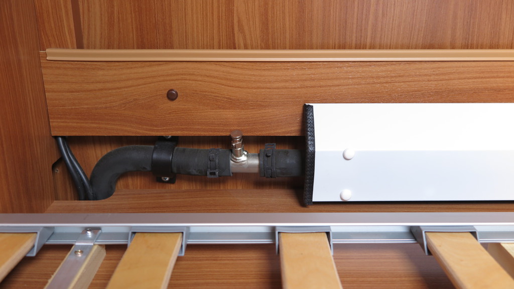 wir haben im WoMo eine Alde Warmwasserheizung und daher im Alkoven jeweils seitlich etwa 1,5m lange Radiatoren /Heizkörper.