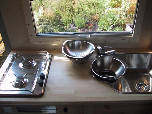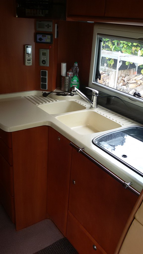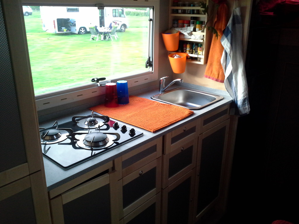 Wieso. Das ist doch genau das was ich meinte. Auch bei Dir ist vorn genügend Platz zum Schnippeln. Da wir doch das Kochfeld nicht als Arbeitsfläche benötigt...... Roman In unserem Selbstausbau-Camper werkelt seit 23 Jahren ein SMEV mit 50mB, ähnlich diesem: Amazon Link , sehr zuverlässig. auf dem einzig freien Platz steht bei Nutzung die Kaffeemaschine. Gut, ne Spülenabdeckung gibt es auch. Wir kochen aber ausser Wasser seltenst im Auto und für Grillfleischzubereitung oder Salate anrichten braucht man auch Platz für Schüsseln und Teller und die stehen dann auf der Herdabdeckung. Ich fände zwei aufgesetzte Kochfelder toll und davor genügend Platz für ein mittelgroßes Scheidebrett. Die Frage ist halt, ob das zum Fenster hin gefährlich wird.. Zumindest ein Feld würde ja 3 kW bekommen. Moinsen, gerade im Urlaub... Auf das CAN-Feld würden wir niemals wieder verzichten wollen! Sieht gut aus und einer wenigen Kocher, die auch Leistung bringen. Dadurch, dass keine Vertiefung vorhanden ist, können die Pötte verschoben werden. In der Tat sind eher nur 2 Flammen nutzbar, allerdings brauchen wir kaum mehr und so hat man die Wahl. Für den Schnellkochtopf ist gerade die ganz Kleine wichtig. Wegen Arbeitsplatz, siehe Foto, da ist genug, direkt gegenüber außerdem die Dinette. ![]() LG vom Mikesch Hallo Mikesch, das sieht ja recht ordentlich aus (offen "schöner" als unser's)... leider nur sehr unpraktisch, hauptsächlich wegen der Ablage- und Reinigungsmöglichkeit: Unser Teil, ähnlich diesem, Amazon Link ,jedoch noch mit 30cm Abtropffläche dazwischen, ist völlig versenkt (also "ebenerdig"), sodass bei Nichtgebrauch eine Pappelsperrholzplatte obendrauf gelegt werden kann. Der Wasserhahn kann nach innen in das Spülbecken geschwenkt werden. Selbstgebaut und ein wenig rustikal... :) Wir haben einen 2flammigen Gaskocher von Eno, auch aus dem Bootsbau. Und um optimal arbeiten zu können die Spüle von Franke. Dafür muß aber der Küchenblock eine Tiefe von 60 cm haben. Man kann auf kleinsetemRaum alle Kocharbeiten erledigen und das Splübecken ist groß genug auch eine Grillplatte zu spülen. Allerdings zu groß um Sie immer mit Spülwasser zu füllen. Wir Setzen für die kleinere Spülmenge eine kleine Plasikschüssel ins Spülbecken gestellt ein. P.S. Eigene Bilder kann ich hochladen. Aber wohin verschwinden die dann? Hier ein Video mit der Spüle im Einsatz. Ich finde sie gehört zum Besten was wir im Wohnmobil haben. --> Link ![]() Hi Berni, Kompromisse beherrschen unser Leben ;-) Wichtig ist uns die kleine Arbeitsfläche, die Abtropffläche ist das zu sehende "Tuch", welches als solches konzipiert ist. Wird einfach zum Trocknen aufgehangen. Meist drückt mir meine U. die Teller eh in die Hand ;-) Zu Reinigen ist die ganze Fläche völlig easy. Kernpunkt war aber der Kocher mit der Leistung. LG vom Mikesch