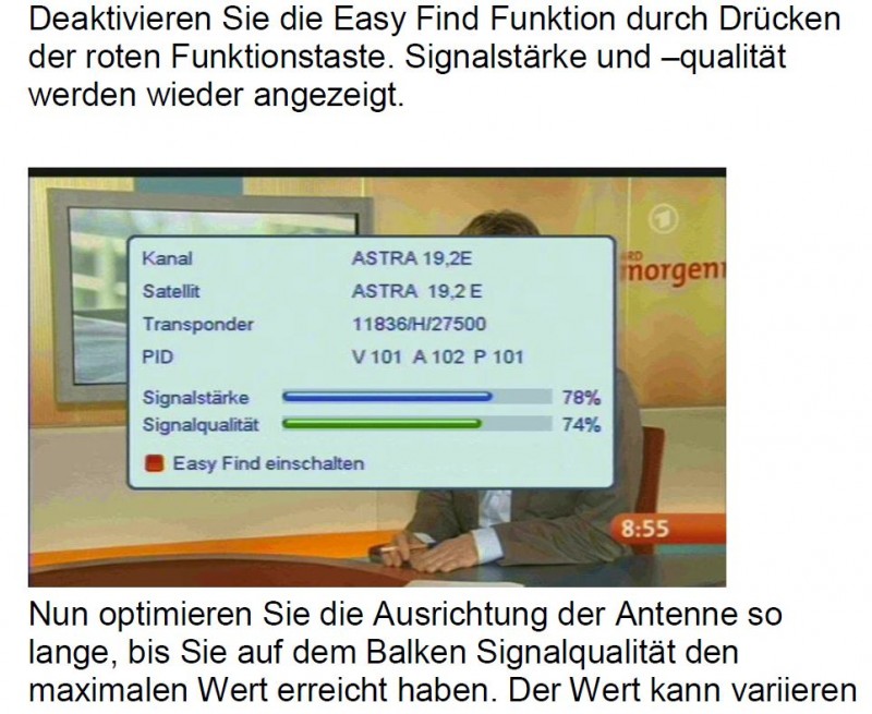 Das LNB ist ja schon digitaltauglich. , Heinz Da hast Du die Funktion nicht ganz richtig verstanden. Die Auswerteeinheit der SAMY (analog) schaut nur auf die Qualität des Videosignals, das der Reciver ausgibt. Hast du keinen, oder schlechten Empfang ist das Videosignal gestört (Schneetreiben) oder gar nicht vorhanden. Sobald das Auswertegerät ein bischen was auf dem Videosignal erkennt, geht es in den Feinsuchmodus. Dabei wird immer nur ein bischen verstellt. Erkennt die Auswerteeinheit, das das Signal besser wird, dann wird die Richtung beibehalten, bis das Signal wieder schlechter wird. Das selbe wird dann noch in vertikaler Richtung probiert, bis keine Signalverbesserung mehr erkannt wird.