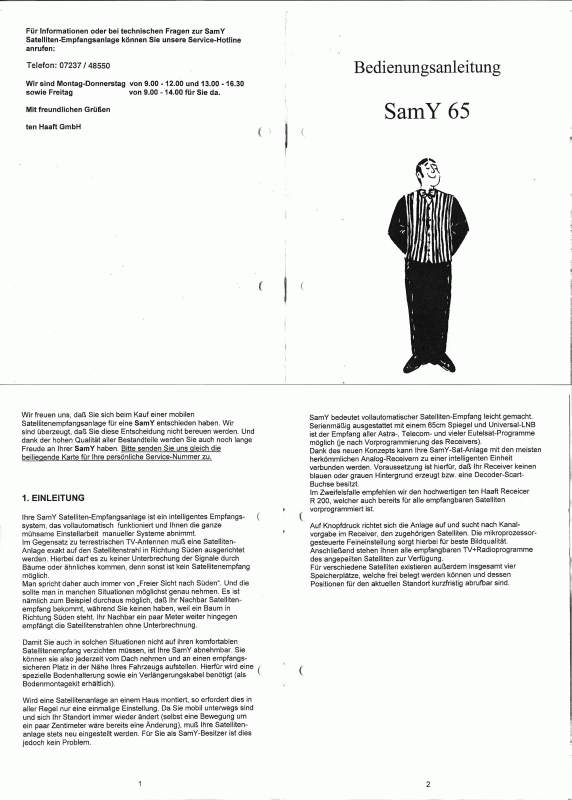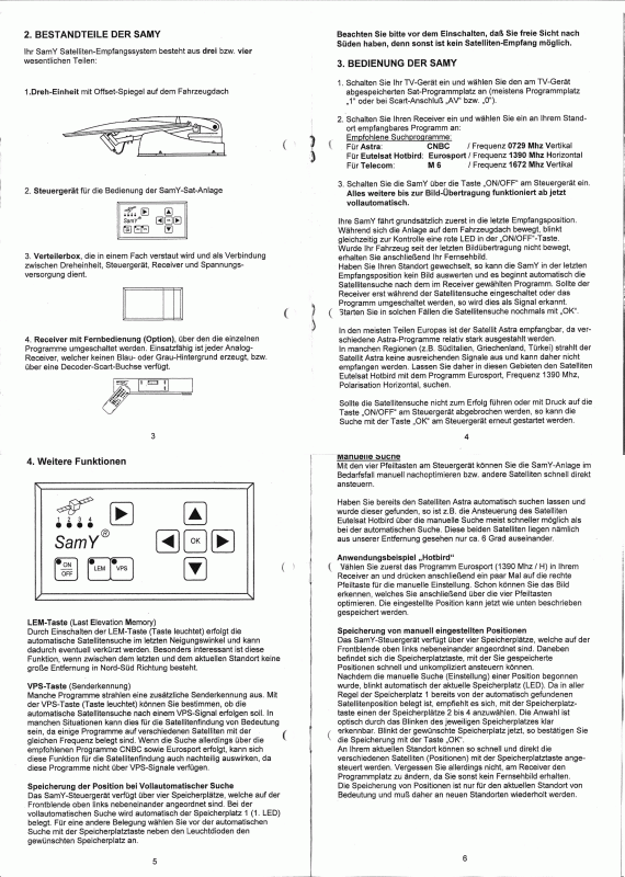 Die digitalen Reciver geben aber immer ein perfektes Videosignal an der Scartbuchse aus (blauer Bildschirm mit Menu's, e.t.c.) das hatten die analogen nicht. Wenn Du also einen dig.Reciver an die SAMY anschließt, glaubt die SAMY sofort nach dem Einschalten, das der Empfang Top ist und höhrt auf nach dem Satelliten zu suchen. Du kannst dann leider nur das Menu des Recivers anschauen. Die neuen Auswertegeräte schauen meiner Meinung nach direkt auf das Signal des LNB (wie ein SAT-Finder). Daher arbeiten die auch Reciverunabhängig. Das sind zwei grundlegend verschiedene Geräte. Die Motoren und das Positioniersystem an der Antenne sind sicher nicht so sehr verschieden, aber halt einfach nicht kompatibel, sonst müsste ja nur die Steuereinheit getauscht werden. Ich kann mir nicht vorstellen, das Du da mit einem PC und ein bischen Software irgend was erreichen kannst. Wenn Du die SAMY im orginalzustand überlisten willst, dann müsstest Du einen Satellitenfinder nehmen und das Signal das der Ausgibt in ein Videosignal umwandeln. Ich habe mir schon gendanken gemacht, leider ist es wegen Zeitmangel dabei geblieben. Man müsste einfach eine Videoquelle nehmen und mit dem Satfinder das Signal stören (Störfrequenz aufmodulieren) Je schlechter das Satsignal ist, desto mehr stören. Ist das Satsignal gut, dann gar nicht mehr stören. (sehr einfach ausgedrückt) Die Satfinder mit analoger Anzeige gibt es für ein paar Euro, den Rest müsste man basteln. Der Umbau bei Tenhaaft, ist schon umfangreicher. Da wird die SAMY ja in eine Qyster umgebaut. Das ist ein komplett anderes Steuergerät. Die Ansteuerung der Antennenantriebe ist sicherlich nicht kompatibel. Daher der hohe Aufwand. Ich werde das mal bei meinem Kumpel in Auftrag geben. Das ist ein unausgelasteter Bastler. wenn der da was zusammen bastelt, dann könnte man damit sicher in Serie gehen. So weit ich mich umgesehen habe, haben doch alle älteren Anlagen nach dem Prinzip der Samy gearbeitet. aus München Hallo, kann mir auch jemand eine Bedienungsanleitung von Samy 65 zukommen lassen? Hallo Bernd,