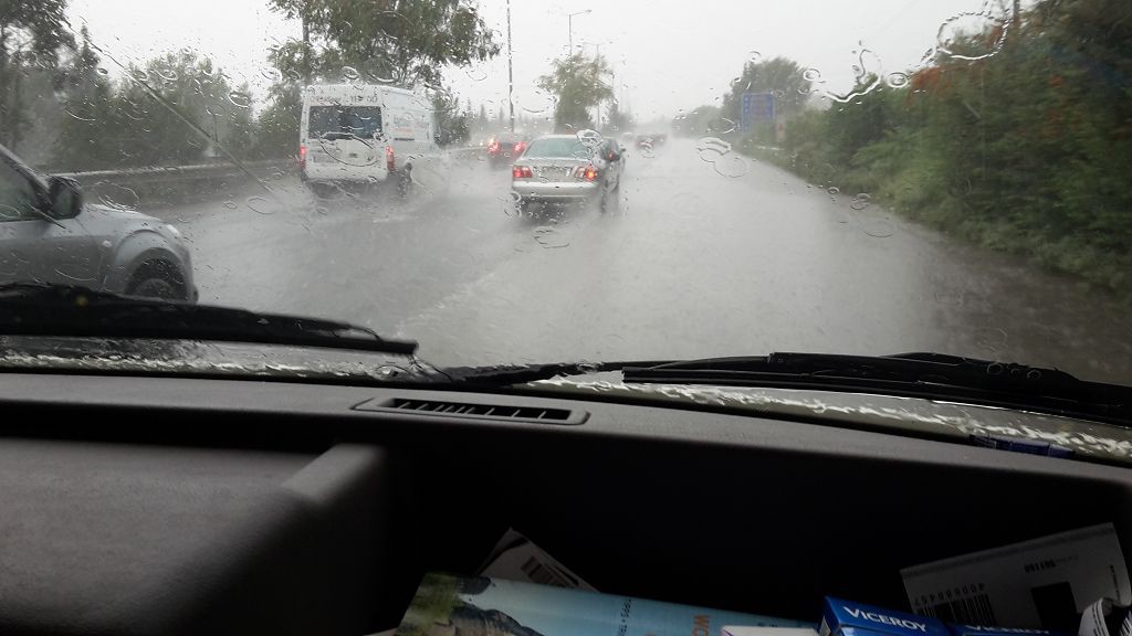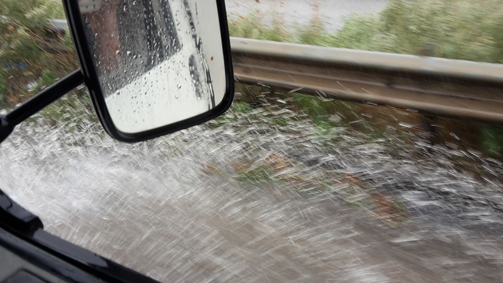 Auf die Bahn Ri. Thessaloniki in der Nacht von Sonntag auf Montag mitten auf der Autobahn stehend, im Starkregen nebst Hagelschlag, verbracht.