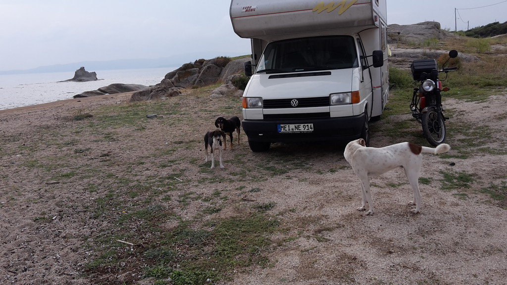 Am Sphinx - Strand :[ N 40° 25.061 E 23° 51.628 ] kurvten wir dann ein. Viele Hunde begrüssten uns und, man traute seinen Augen kaum,
