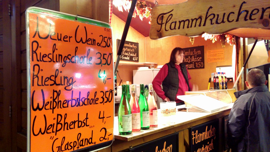 Ein regionaler Anbieter verkauft neuen Wein als "Bizzler" in Super Qualität für 2,50 den Schoppen. Ich entscheide auf Weißherbstschorle und greife zu. Der Weißherbst ist aus Dornfelder und die Mischung im Glas ist richtig satt! Lecker und das für 3,50. :D