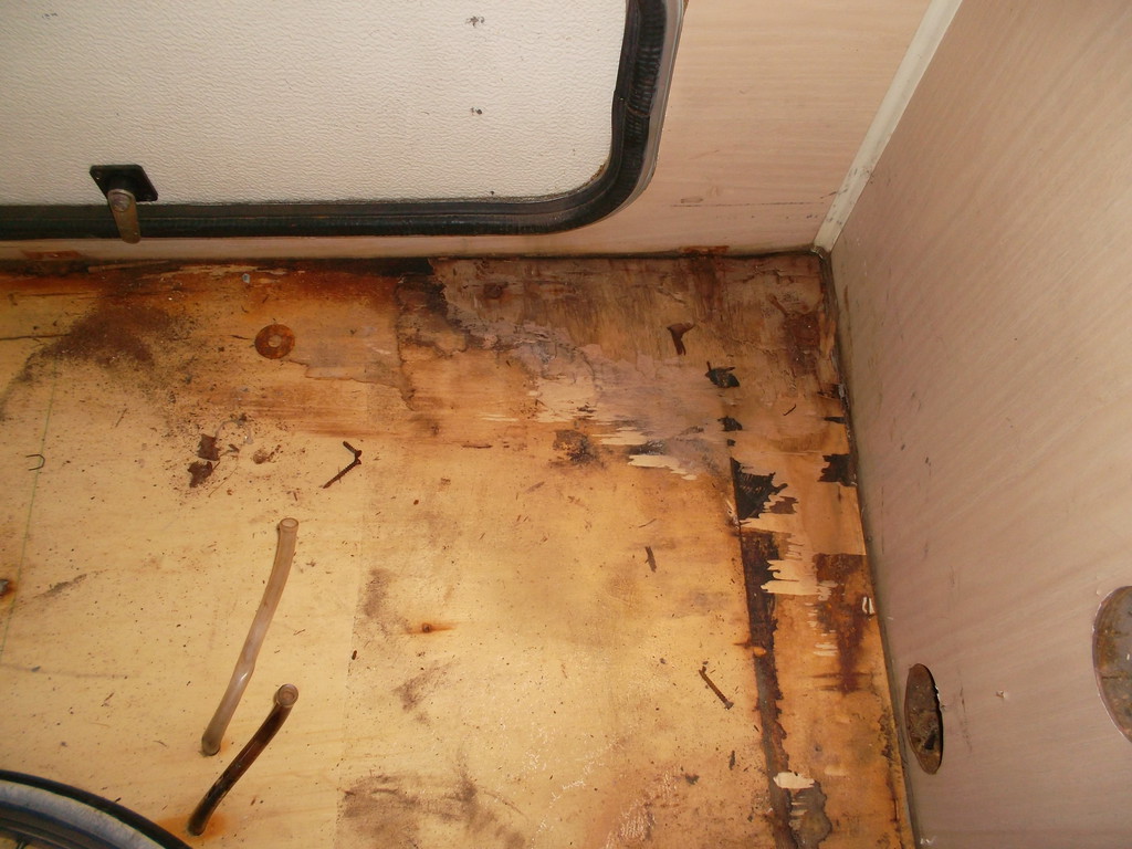 Die gesamte Inneneinrichtung ist herausgenommen. Die undichten Wasserleitungen befanden sich im Zwischenboden, somit sah man nur von unten wie es tropfte. Ab Heute werde ich den Boden raus nehmen um die Leitungen neu zu verlegen. Teile des Bodens müssen auch ersetzt werden, da der Trumanik Boiler wohl das ein oder andere Mal zu viel Wasser verlor und sich das Holz darunter schon schwarz und moderik zeigt.