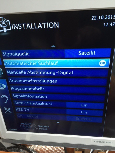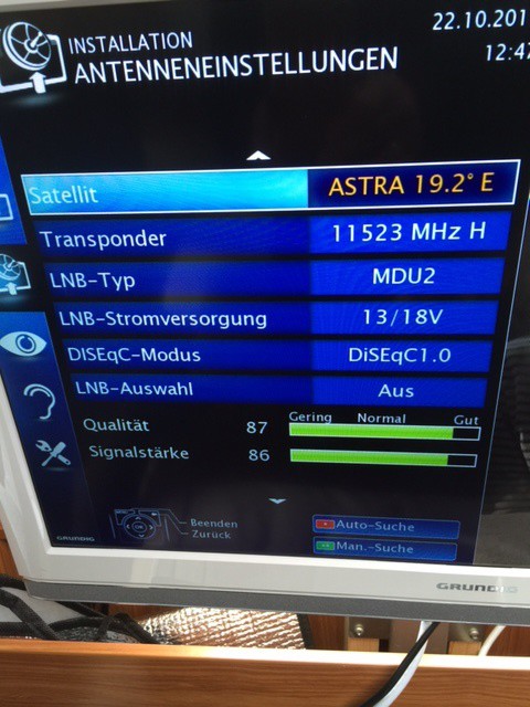 auf dem Dach sitzt eine Teleco DV3S2 das Signal geht in einen 220 V Grundig FS mit eingebauten SAT Receiver. Das Signal liegt vor ..... ich kann jedoch nur wenige Sender empfangen . Astra meine ich .....