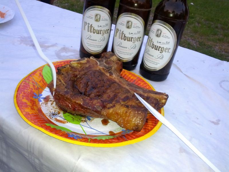 Hier bin ich gerade mit paar Kumpel am Grillen. Damit man einen Größenanhlat hat. der Grill hat etwa einen Durchmesser von 1,3m. Die Männersteaks liegen Vorne ! Mädchensteaks nach hinten. Die Würstchen waren für die Kinder. Also überlegs Dir und ausserdem gibt dann auch was RICHTIGES zu trinken.
