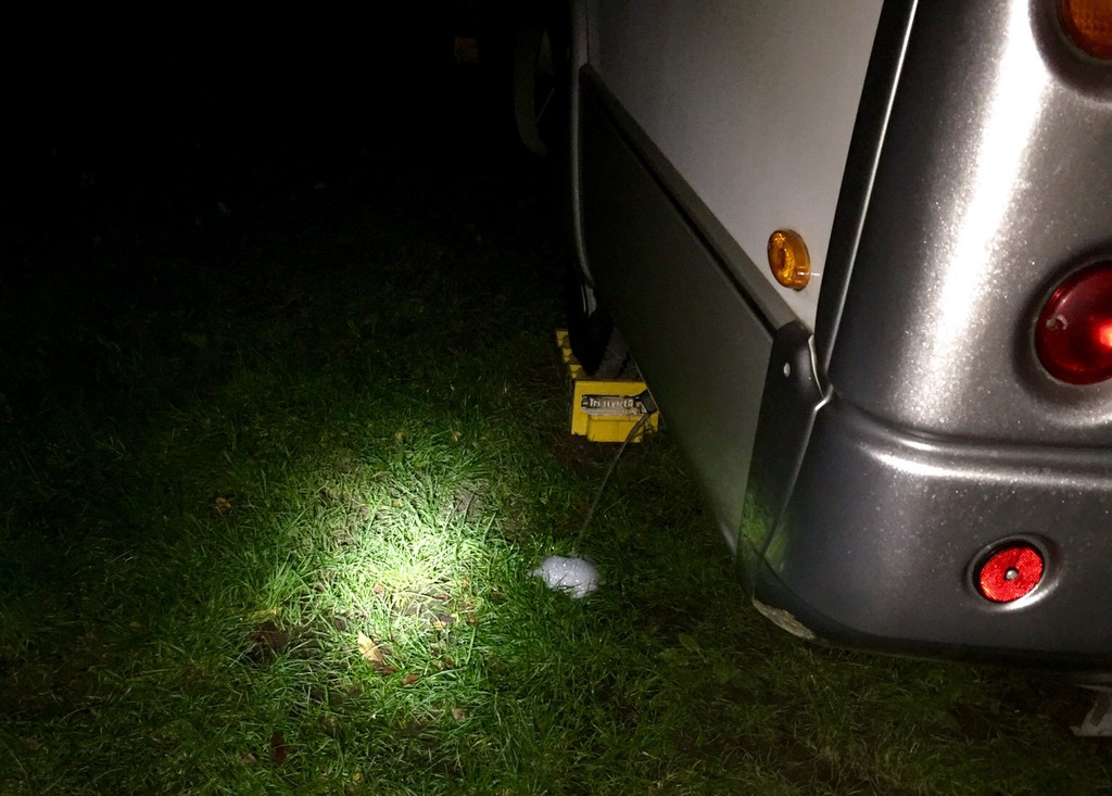 1. SP in Südtirol neben SP Kalterer See. Wir sind im dunklen angekommen und wollten gerade aussteigen und das Fzg nivellieren. Beim Aussteigen hörte ich ein Plätschern und dachte irgend etwas wäre bei uns passiert. Taschenlampe geholt, unters Fzg geleuchtet, nix zu sehen. Dann dem Geräusch gefolgt und beim Nachbarn folgendes (s. Bild) gesehen. Man muss noch erwähnen, dort war leichte Hanglage, nach 10 Minuten standen die Nebenplätze unter Wasser. Wir haben uns dann einen anderen SP gesucht, da wir nicht neben so einem Saubären stehen wollten.