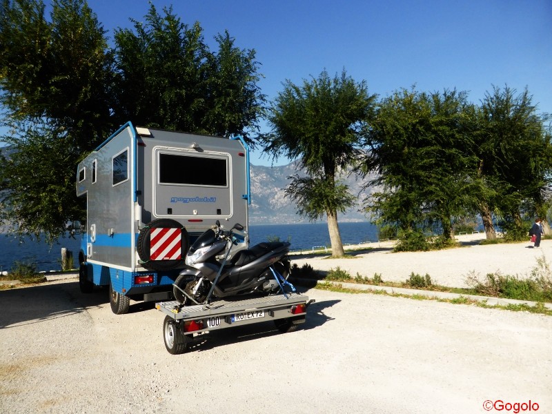 Lange haben wir überlegt, ob wir unseren Roller auf dem Wheely (Anhänger) auf die Reise mitnehmen sollen oder nicht. Unter Berücksichtigung, dass wir ein knappes halbes Jahr unterwegs sind und nicht nur mit dem Gogolobil herumfahren werden, sondern durchaus auch mal längere Pausen auf schönen Campingplätzen machen haben wir uns entschlossen, den Roller mitzunehmen. Nicht nur um damit morgens frische Brötchen zu holen sondern durchaus um verschiedene Ausflüge in die nähere Umgebung damit zu machen. Das Basisfahrzeug bleibt dann am Campingplatz. Klar, durch den Roller werden wir in Frankreich auf der Autobahn mit der Maut kräftig zur Kasse gebeten, sind wir dann als 3-Achser in der Kategorie 4, das ist so teuer wie ein 40-Tonner Lkw! Auch auf der Fähre haben wir insgesamt ein längeres Fahrzeug und es ist teurer. Aber das (die Flexibilität) ist es uns letztlich wert. Und trotzdem können wir auch mit dem Gogolobil einige Fahrten direkt in die Sahara machen (vielleicht sogar dort im Sand übernachten), wenn wir den Anhänger samt Roller irgendwo sicher abstellen können. Für was haben wir permanenten Allradantrieb und drei Differentialsperren? Solche Ausflüge nenne ich dann „artgerechte Haltung“ für das Gogolobil.
