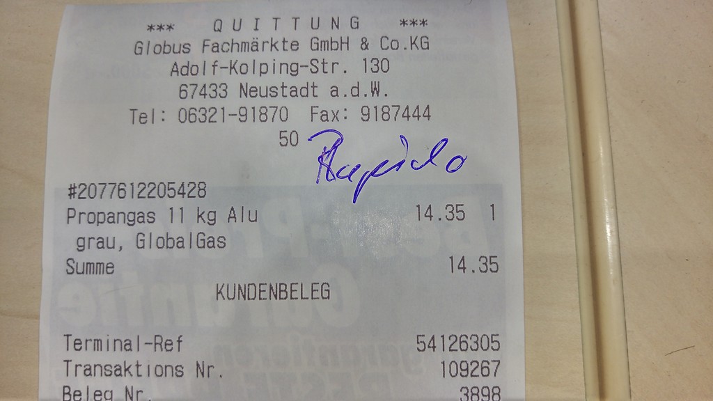 Albert, irgendwas ist bei euch falsch! Bei uns ist der Preis dieses Jahr immer um die 13,50 bis 14,80 gewesen. Motz dort mal oder schreib an die Globus Zentrale! Gestern Abend - Globus Baumarkt - 14,35 € für 11 Kg Alugas. Hier mal für dich zur Vorlage bei deinem Markt der Beleg: ![]() Dein Alf Gestern bei Reicherts in Overath: 11kg graue Stahlflasche: 16,90€ 23.10.2015 Hornbach Wihlemshaven 14,40 Euro Frank Ihr lebt aber günstig.. :gruebel: :cry: ![]() 9kg Gas in Tasmanien 38,00 australische Dollar. Guten Tag, heute in Verden / Aller beim Hagebaumarkt 11 kg 19,99 € eragon Moin heute Baumarkt Kamp Lintfort 11 Kg 16.50 Euro Hornbach Bremerhaven, 11 Kg= 14,40 € Obi aktuell 11kg für 14,99 Euro Hornbach Esslingen 11kg: 14,40€ Bauhaus Stuttgart Untertürkheim 11gk: 14,40€ Bauhaus Aalen (Essingen): 11kg 17,95€ => 12% Tiefpreisgarantie auf Hornbach Esslingen macht einen effektiven Preis von 12,67€ Wohnmobile Singhof hier in Limburg 12,95€ Dauerniedrigpreis. ![]() Kai Bauhaus Hanau auch 14,40 also 0.65 € der Liter ... Letzte Woche direkt bei Progas in Kassel 0,84€/Liter Brenngas :-( Hallo Zusammen, OBI in Rheinbach hat am 11.12.2015 und am 12.12.2015 Propangas Füllung für Kauf oder Pfandflasche 11KG zu 10€. € 0,91/KG Klaus bei Camping Krings in Mönchengladbach gestern 14 Euro für 11/KG der Uwe Hallo zusammen, Caravancenter Moormerland 13,90€ / 11 Kg. Der Globus Baumarkt im Vogtland führt kein Alugas. Wegen mangelnder Nachfrage wie man mir erklärte. Deshalb in Dresden am Stellplatz 21,50 bezahlt. Fühle mich abgezockt. Angeblich sind doch die Kosten im Osten geringer? Globus Unna 14,35 Euro BayWa Bad Windsheim, leider aktuell 17 Euro für die Füllung einer 11kg Flasche... ...immerhin von 19 Euro mal endlich auf 17 runter Ist schon frech bei dem niedrigen Ölpreis immer noch so viel aufzurufen... OBI Offenburg gestern 17,50 €. Bisher waren es 14,40 €. Das ist der Weihnachtsgeschäftszuschlag. |