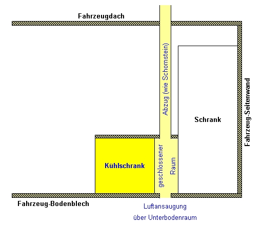 Ich bin noch am sondieren, was den Ausbau eines T4 betrifft. Also nicht alles auf die Goldwage legen, vieles ist noch zwischen Theorie und Planung. Einen Kühlschrank baut man an die KFZ-Außenwand. Das ist üblich. Dann bringt man zwei Lüftungsgitter an. Eins ganz unten, und eins oben, möglichst über Oberkante Kühlschrank. Der Abstand zw. Kühlschrank und Fahrzeug-Außenwand sollte ca. 2 cm betragen, wegen dem Kamineffekt und damit die Luft besser zirkuliert. Alles so weit bekannt. Wenn die Kühlschrank-Rückwand nun aber nicht an die Fahrzeug-Außenwand zeigt, was dann? Da gibt es noch die Lösung mit dem Kamin. Hat das schon mal jemand gemacht? Welche Erfahrung? Eigentlich (laut Meinung im inet) soll ein Kamin besser zirkulieren als die Lösung mit den zwei Lüftungsgittern. Hier eine kleine Skizze --> Link Viele Grüße Bernd EDIT: Hätte das Bild gerne hochgeladen, "Dateianhang hochladen" geht bei mir aber irgendwie nicht Sieht doch schon gut aus..... :ja: Ist sicherlich ne Möglichkeit. Aber wenn Du den Kühli um 90 Grad drehen könntest, wäre ja auch die Seitenwandlösung denkbar.... :gruebel: Grüsse Felix52 :) Hallo Bernd, ich habe keine Erfahrung mit einem Dachkamin für den Kühlschrank. Im Prinzip müßte diese Art gut funktionieren. Hier im Forum habe ich aber auch gelesen, dass es mit dem Effekt bei einem Dachkamin nicht so war, wie man es sich vorgestellt hat. Es war sogar, wenn ich mich nicht täusche, sogar die Rede von einer Verlängerung ( Aufsatz ) des Dachkamines, um eine bessere Zirkulation zu erreichen. Ob es stimmt: Fragezeichen. Kenne nur das System mit oberem und unteren Lüftungsgitter und Abgaskamin neben dem oberen Gitter. Aber zu der Anordnung ( Zeichnung ) des Kühlschrankes habe ich eine Frage. Ist die Zeichnung so zu deuten, dass man den KS von der Seite sieht oder die Rückseite des KS :?: . In beiden Fällen ist aber zu bedenken, dass bei einer evtl. Reinigung des Abgaskamines bzw. der Brennerdüse dies ohne eine separate Serviceklappe dies nicht möglich ist. Wo ist der Abgaskamin auf Deiner Zeichnung zu sehen oder wird der KS nur mit 12 V oder 230 V betrieben :?: . Gruß Manfred Abgaskamin bei einem Kühli, ist nur für das Abgas, aber hat an sich mit der zirkulation nicht viel zu tun. Die Zirkulation ist hauptsächlich für die Kühlung der Rippen des Kühlis, denn wenn die nicht genug kühlung bekommen ( abführen der warmen Luft ) dann kühlt das Teil eben viel schlechter. Deswegen werden auch bei den Geräten des öfteren kleine Gebläse angebaut, um die Zirkulation zu stärken. Das Bild war für meine Anfrage an Dometic. Nicht ganz optimal, um hier im Forum ins Detail zu gehen. Hab die Skizzen also nochmal neu gemacht, ist ja mit Excel kein Problem. Bild 1 Normaler Einbau, also mit zwei Lüftungsgittern ![]() Bild 2 Alternativer Einbau, mit Kamin. ![]() Den Grund sieht man auch: Es ist der um 30cm breitere (also "tiefere") Schrank Warum ich so kompliziert denke, werden einige fragen? Es wäre doch am einfachsten, den Kühlschrank vorzuziehen, und dahinter den Platz einfach freizulassen. Also den Kühlschrank vorziehen, und trotzdem die beiden Lüftungsgitter verwenden. Wahrscheinlich werde ich das auch tun, schon allein weil ich mit der Kaminlösung auch keine Wartungsklappe habe. Zumindest habe ich noch keine Idee, wo die Klappe sein könnte. Was mir allerdings zu denken gibt, ist die Tatsache, dass in einem so großen Zwischenraum wohl kaum (bzw. gar keine) Kaminwirkung entsteht. Im Zweifel - der sonnige Süden lässt grüßen - kühlt der Kühlschrank nicht mehr runter, weil sich dahinter die heiße Luft staut. Schwierig, sowas nur am Denkmodell entscheiden zu müssen. EDIT: So das mit den Bildern habe ich jetzt auch hingekriegt :) EDIT 2 (19:57): Außerdem könnte ich mir vorstellen, dass es termische Vorteile hat, die Luft von unten reinzuholen. Auch wenn es laut einiger Tests kaum Unterschied macht, ob die Luftgitter der prallen Sonne ausgesetzt sind :cry: sagt mir mein Bauchgefühl, dass Luft unter dem Auto immer kälter ist als in der prallen Sonne. Hallo BerndDerBus Die Luft von unten könnte Vorteile bringen, mit einen Leitblech zwischen Aussenwand und Kühlrippen so anpassen,damit die Luft nur durch die Kühlrippen kommt. Gruß Willi Hallo Bernd, gibt es einen Grund, weshalb du keinen Kompressor Kühli verwenden willst ? Gruß Roman