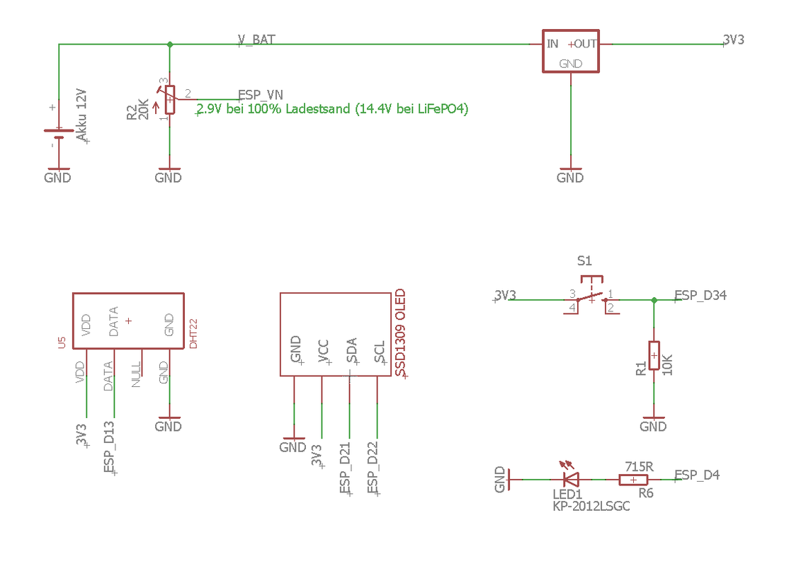 Links oben ist der zu überwachende Akku eingezeichnet. Dessen aktuelle Spannung wird über einen Spannungsteiler (R2 mit 20 kOhm) auf den VN-Eingang des ESP32 gelegt. Achtung: vor Inbetriebnahme den Trimmer ganz nach unten auf GND drehen und erst bei vollem Akku langsam nach oben regeln; wenn an ESP_VN 2,9 V anliegen, ist die Einstellung perfekt. Dreht man zu schnell hoch oder fängt man in einer zu hohen Stellung von R2 an, kann das schnell das Ende des ESP32 sein, da der am VN-Eingang maximal 3.3V verträgt.