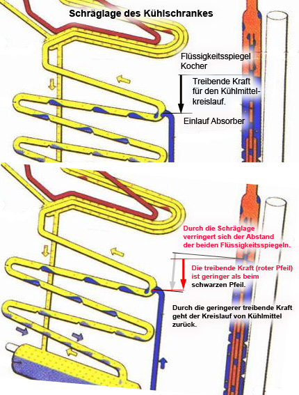In den Absorber-Kühlschränken im Campingbereich gibt es keine Drucktrennung und somit auch keine Drossel. Das ist Unsinn. Hierzu 2 Bilder. Der Kocher oder Austreiber ist neben dem Kaminrohr angeordnet. die unteren beiden Bilder. In das Kaminrohr ragt der Brenner mit einer Flamme von ca. 5 cm Höhe. Die Flamme kann nie den Kocher verfehlen. Es ist die heiße Verbrennungsluft die den Kocher aufheizt. Noch so ein paar geistreiche Beschreibungen. Ist natürlich Unsinn. Das wäre wohl der einzige Ort auf der Erde an dem keine Schwerkraft wirken würde.