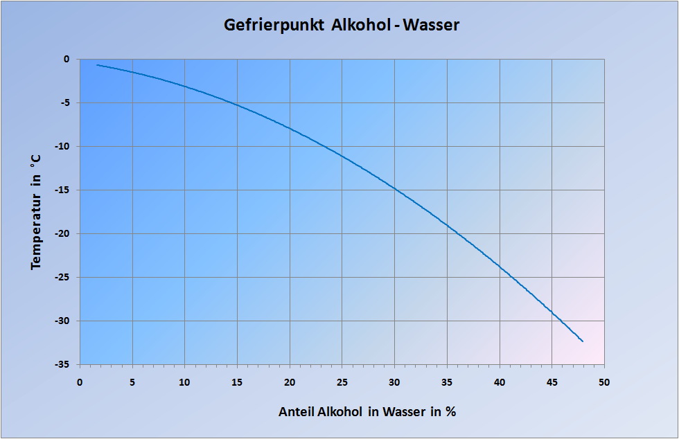 Zumindest Scheibenfrostschutz ~ Alkohol ist auch nicht schlechter als Salz zur Natur. RK Hmmm ... hab ich was verpasst? Gerade haben wir unseren alten Eura verkauft. Wir hatten ihn 22 Jahre. Ich habe immer nur wie in der Betriebsanleitung vorgeschrieben die Wasserhähne, die vorgesehenen Entwässerungsventile und den Ablasshahn des Tanks geöffnet und zum Abschluss die Pumpe noch kurz trocken nachlaufen lassen. Das war's . Frostschäden ... was ist das? Ausblasen, Frostschutzmittel, in Polsterfolie einpacken :gruebel: Wozu? Noch etwas zur Anwendung von Kochsalz als Frostschutz im Siphon. Die Siphons im WoMo bestehen aus Kunststoff da ist Kochsalz kein Problem. Bei Metallen ist es nur bedingt zu empfehlen. Das Kochsalz direkt in den Siphon geben. Das Becken selbst besteht aus Edelstahl und Kochsalzkristalle darauf sollten säuberlich entfernt werden. Edelstahl und Kochsalz in Verbindung mit Feuchtigkeit vertragen sich nicht, deshalb Kochsalzkristalle entfernen. Vor der Betrachtungsweise aus gesehen ist es sicherer Spiritus (Alkohol) zu verwenden. Hier ein Diagramm zum Frostschutz von Alkohol. ![]() Gruß Scout