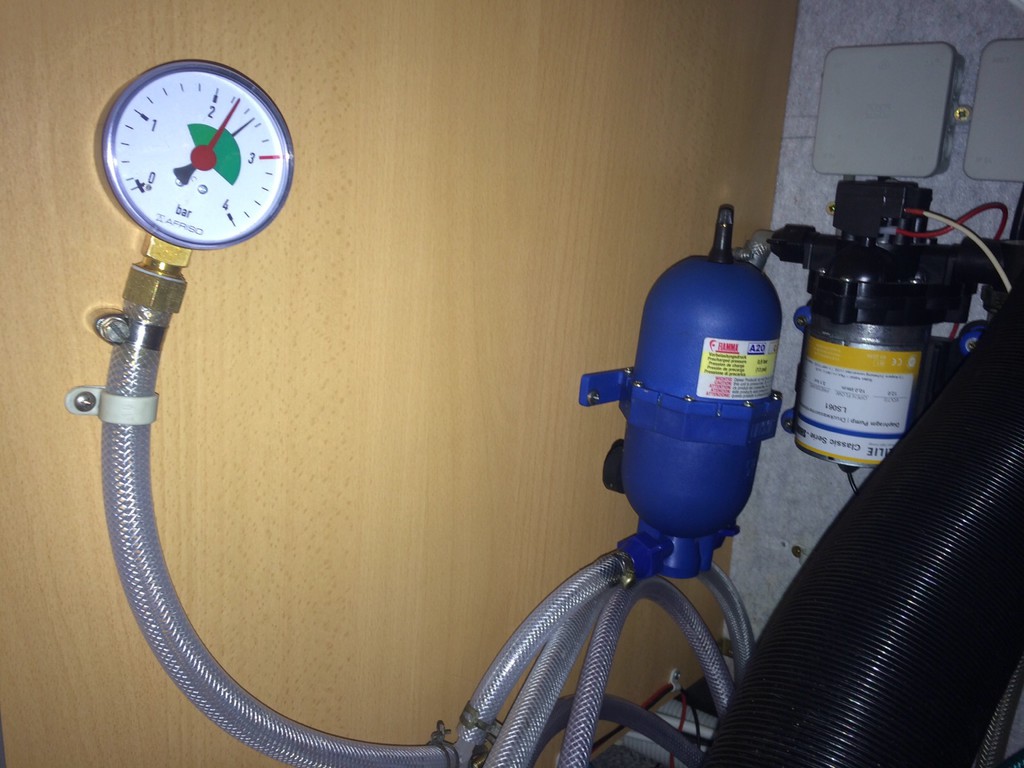 Den Vordruck stellt man übrigens auf den Einschaltdruck der Pumpe ein. Bei mir 1.1Bar. Habe gleich noch einen Manometer montiert. Nun ist alles dicht und der Druck bleibt bei 2.2Bar.