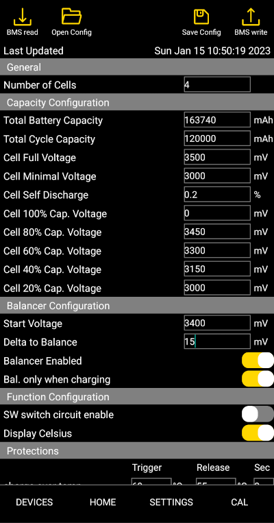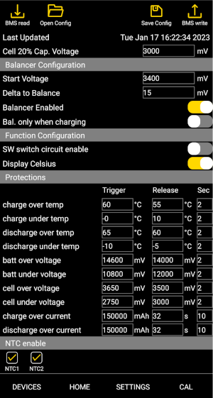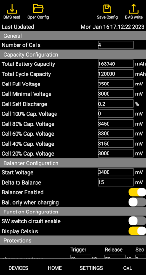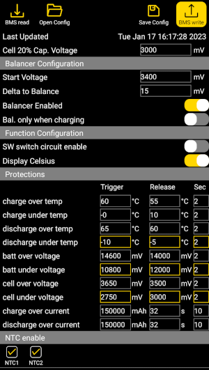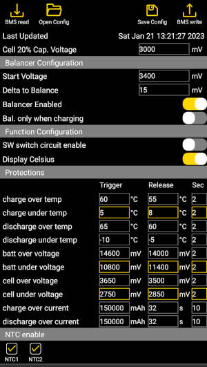 Erklärt viele aber nicht den hohen Wert bei Untertemperaturabschaltung. Könnte ein Fehler in der App sein. Das BMS hat das schlimmste verhindert. Hoffentlich. Ich würde folgendes Umstellen. cell undervoltage 2750 Batt undervoltage 10800 Discharge undertemperatur -10 Und release -5. Charge balance hast du ausgeschaltet und auf 15 mv Differenz gestellt. Balancier den Accu auf 15 mV bei einer Spannung von 14,5 volt aus. Dann würde ich den Accu mal testen auf Kapazität. Nach meinen Vorgaben. Franz