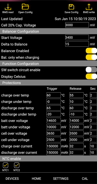 Stocki333 hat geschrieben:Ich würde folgendes Umstellen. cell undervoltage 2750 Batt undervoltage 10800 Discharge undertemperatur -10 Und release -5. Charge balance hast du ausgeschaltet und auf 15 mv Differenz gestellt. Balancier den Accu auf 15 mV bei einer Spannung von 14,5 volt aus. Dann würde ich den Accu mal testen auf Kapazität. Nach meinen Vorgaben. Franz