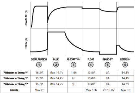 Die Bulk-Phase (2) sollte bis zur Ladeschluss-Spannung gehen und den AKKU voll aufladen. Ich würde den Wahlschalter auf B (Blei-GEL 14,4/13,8 V stellen, nicht Stellung C !). Du wirst also bei der Abfahrt einen vollen AKKU haben können, wenn es die Zelltemperaturen zulassen.
