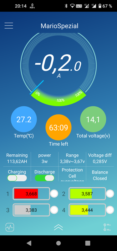 Moin, und von den tausenden die Problemlos laufen, liest man nichts! Also du hast 2 Probleme. Irgendwoher bekommt dein Akku eine zu hohe Ladespannung. Addiert man die Zellwerte kommt man auf 14.52v. Entweder ist der Ladebooster auf AGM oder Blei/Säure (14,7v) gestellt, oder wie - oben von Jörg schon geschrieben - an deinem EBL ist ein falsche Ladekennlinie eingestellt. (Solar hast du nicht?) Nachdem du den Ladebooster ja schon ausgeschlossen hast, solltest du mal die Dip-Schalter deines EBL kontrollieren. „Gel“ (14.4v) wäre die richtige Einstellung! Du schreibst ja auch, dass das am Landstrom passiert, also ist es mir ziemlicher Sicherheit der EBL. Des Weiteren ist dein Akku nicht ausbalanciert (wurde aber auch schon geschrieben). Momentan kann der sich aber auch gar nicht ausbalancieren, weil er ja sofort in die Überspannung läuft. Für die spätere, richtige Konfiguration einmal hier im Forum die Sufu nutzen, da gibt es haufenweise Infos. Lg Kai Hallo, die Fehlermeldung ist nervig, aber ich würde mir jetzt den Urlaub nicht zerstören lassen. Es ist im Augenblick (hoffentlich liege ich da nicht ganz daneben) so, dass der Akku nicht mehr ganz voll geladen wird, weil das BMS wegen Überspannung von zwei Zellen abschaltet. Das muss nichts mit dem Ladegerät zu tun haben. Es ist die Frage, ob die App sagen könnte: "Die Spannung bei zwei Zellen ist zu hoch, obwohl zwei noch zu niedrig sind." Ich denke, dass die App halt einfach vor einer Überspannung warnt. Die Batterie ist aber trotzdem nicht leer. Allerdings wird sich das Problem aufschaukeln. ich würde es daheim in Angriff nehmen, außer Du brauchst jetzt im Urlaub die volle Kapazität der Batterie. Aber für die "Dr.-Franz-Kur" brauchst Du halt ein wenig Ausrüstung, die man normal nicht dabei hat. Und zurückgeben ist während des Urlaubs in Norge wohl auch keine Option. Also entspannen, am Land freuen, und daheim dann anpacken! Gruß Klaus Ich würd‘ mir auch erstmal den Urlaub nicht vermiesen lassen! Wenn bis jetzt alles funktioniert hat dann würde ich auch nicht irgendwelche Einstellungen ändern ( DIP-Schalter ). Vor allem nicht wenn ICH nicht genau wüsste was ich da mache! Da man in Norwegen ja ab und an mal ‘n paar Kilometerchen an einem Stück fährt könntest Du vielleicht mal drauf achten ob der Akku bei „Ladung durch Motor“ den selben Fehler bringt wie beim Laden mit Landstrom? Ansonsten: schönen Urlaub! Grüße Dirk