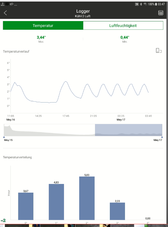 Physikalisch würde ich selbst das auch eher nicht vermuten, die "Arbeit" an sich bleibt doch eigentlich die gleiche. :gruebel: Wenn ich einen Kühli nur auf 12V betreiben wollte würde ich den Absorber rausschmeißen und einen Kompressor einbauen. Der ist effizienter und geregelt. Problem gelöst. Hier noch die Hysterese bei Temp. Mittelstellung 230V WR, dieser Sensor zur Fernüberwachung liegt in der Türablage, ist also der wärmste Bereich im Kühlschrank. Die Hysterese ist mir genau genug.