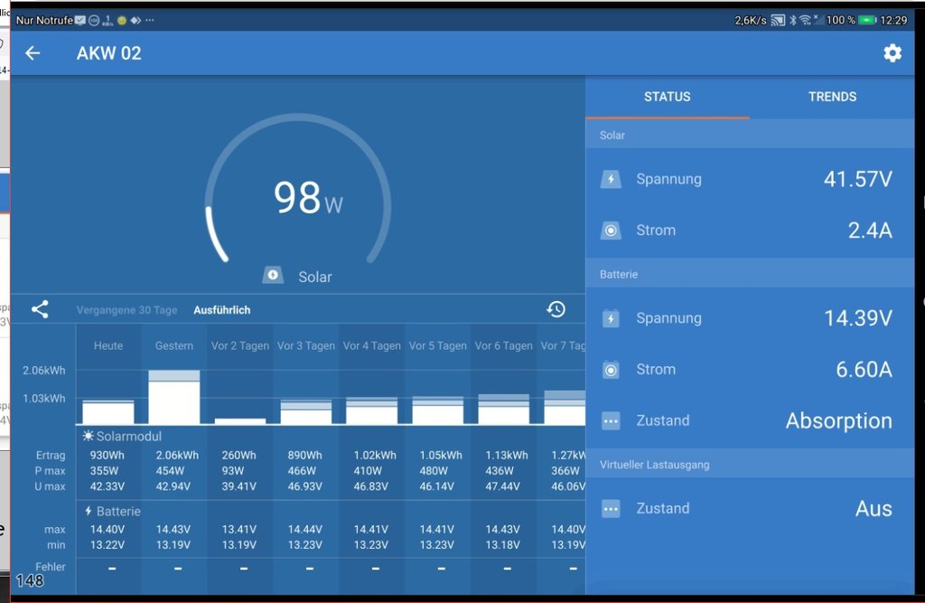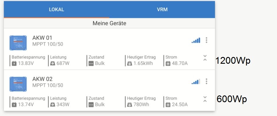 Zu warm, im Mai? Ggf. sogar bei Fahrtwind? Na ok, irgendwie musst Du Deine Aussagen ja "belegen". :wink: Btw. gibt es hier im Forum genügend Beweisbilder von Panelen, die > 100% Peak liefern oder geliefert haben und die waren auch flach montiert. Auf meinem Campervan haben flach montiert meine beiden parallel geschalteten 100WP Module (idetische Module!) bei Idealbedingungen permanent bis zu 220 Watt gebracht. In meiner jetztigen Konstellation (identische Module!) riegelt der 50er Victron ab ca. 720WP ab, daher ist es etwas schwieriger, zu sagen, ob die Module selber noch etwas mehr liefern würden. Hallo Irmie, meine bescheidenen Meinung nach, Deine Solar ist völlig iO. :wink: gerade vorhin 19°C Schattentemp. Wolkenloser Himmel Normalzeit 10:30Uhr Sommerzeit 11;30Uhr Module nicht ganz flach, wenige Grad in Ost/West. Also gut aufgeheizte Module, keine Max Pik Werte durch Wolkenschatten Lauf, sondern echte Dauerleistung. Letztes Putzen vor nem Jahr vielleicht, beim Nachrüsten der letzten 3x30Wp Dinger. --> Link AKW1 4x150Wp 3Jahre alt + 4x55Wp 28 Jahre alt + 9x30Wp 13Jahre alt + 3x30Wp 1Jahr alt immer zwei gleiche in Reihe (seriell) und die dann alle parallel. AKW2: 4x 150Wp alle gleich 3Jahre alt. 2mal parallel und die in Reihe Dazu die Spitzenwerte der Woche von AKW1 Vergleich zu Franz notierten Werten. Bei 50A macht der Regler zu. Beide hängen am selben Speicher etwa 13kWh. So ein Mischmasch von Alter Größen usw bei AKW1, und nun, im Verhältnis/Vergleich zur optimalen Anlage AKW2, trotzdem die doppelte Leistung Ertrag, oh welch Wunder. :lach: Und ja, wer nun nachrechnet, AKW 1 sind nur 1180Wp, :oops: Spielt doch eh keine Rolle. Hier noch die Übersicht von AKW2, ist oben verloren gegangen :oops: jetzt aber schon auf Absorption,