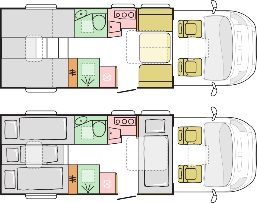 Ich würde an Eurer Stelle bei den Kandidaten auch mal ausprobieren, wie die typischen Abläufe außerhalb des Betts so sind. Also, mal im Bad stehen und die Bewegungen machen, die man beim Waschen oder Duschen macht. Einen Topf mitnehmen und mal die Bewegungen machen, die man beim Kochen oder Spülen macht. Mal an der Dinette sitzen und die Bewegungen machen, die man beim Essen macht. Für uns hat sich dabei herausgestellt, dass bei einem 6m-Fahrzeug mit Längsbetten Dinette, Küche und Bad so eng sind, dass das keinen Spaß mehr gemacht hätte, in dem Wohnmobil zu wohnen. Selbst bei 6,36m (wir haben nach Kastenwagen gesucht) waren Bad und Dinette üblicherweise noch enger als bei einem 6m-Fahrzeug mit Querbett. (Beim Kastenwagen wirst Du mit 6,36m und 3,5t auch nicht wirklich glücklich.) Wir haben daher ein 6m-Fahrzeug mit Querbett genommen. Wenn ihr Wert auf das Längsbett legt, kann es also sein dass es schon eher Richtung 7m gehen sollte. Die Queenbetten hatten für mich auch den Nachteil, dass sie alle vorne abgerundet sind und damit nicht durchgehend lang genug für mich. Die ganz kurzen mit Längsbetten haben meist auch nur einen kleinen, untergebauten Kühlschrank. Das kenne ich noch aus dem Wowa und wäre für mich ein No-Go. Das angepeilte Preissegment finde ich vom P/L etwas undankbar. So einen LMC Tourer (eher leicht, vor allem ohne Lift) gibt es als Jahreswagen aktuell ab 55k. Finde ich die interessantere Alternative. Servus Fred, schau dir mal den Carado T447 an, ist zu zweit mit 3,5 t machbar (knapp, aber geht) und hat das, was du dir vorstellst, 2 bequeme Längs-Einzelbetten im Heck, separate Dusche usw. Bin ich selber 10 Jahre gefahren und war damit top zufrieden.